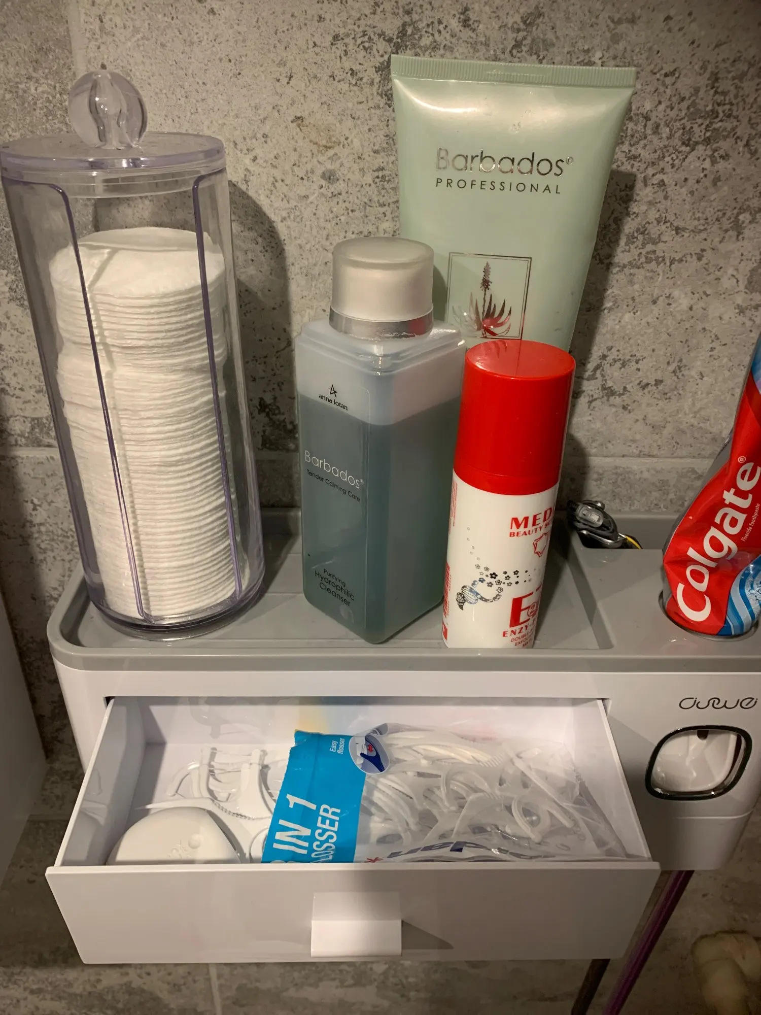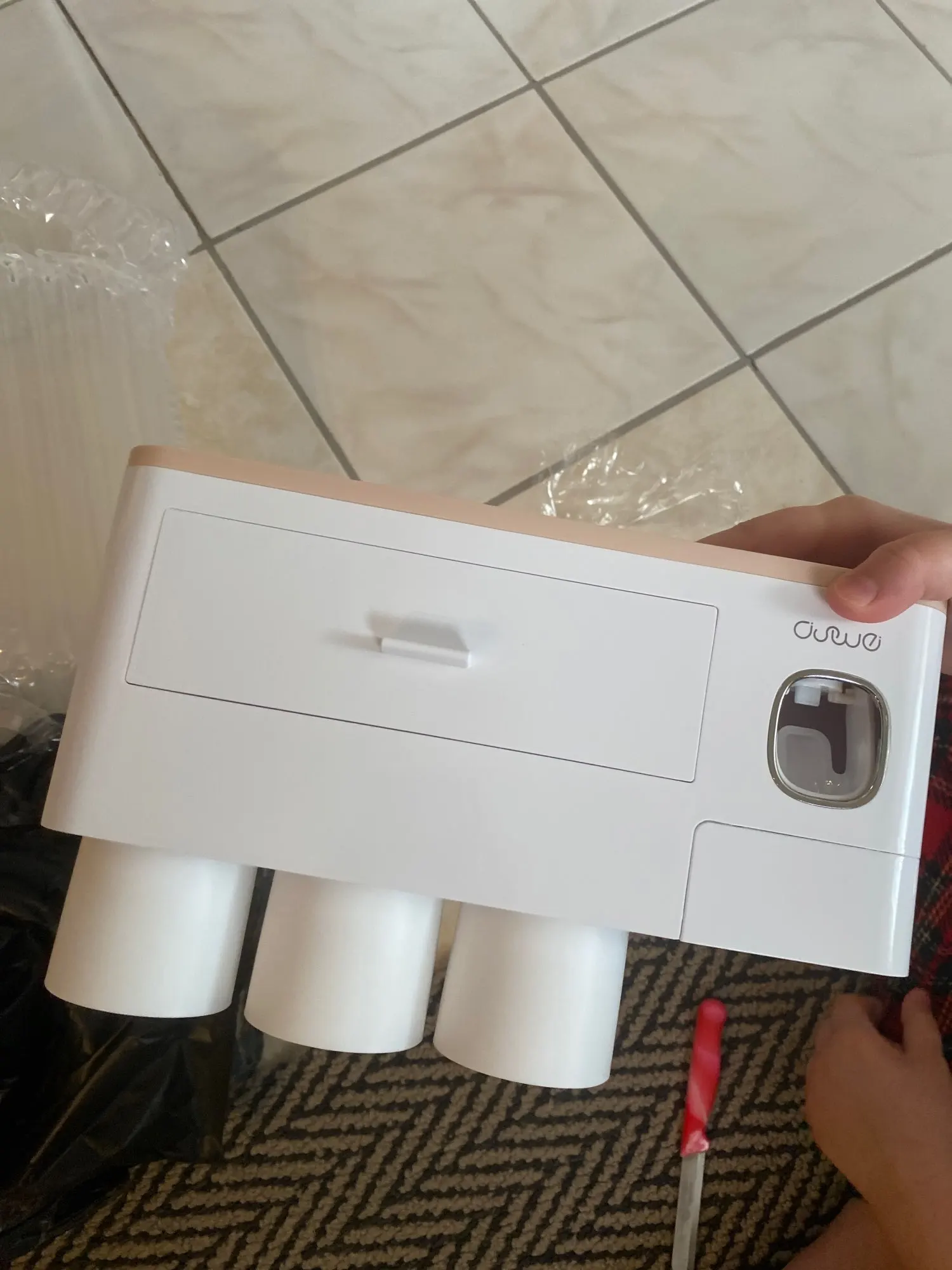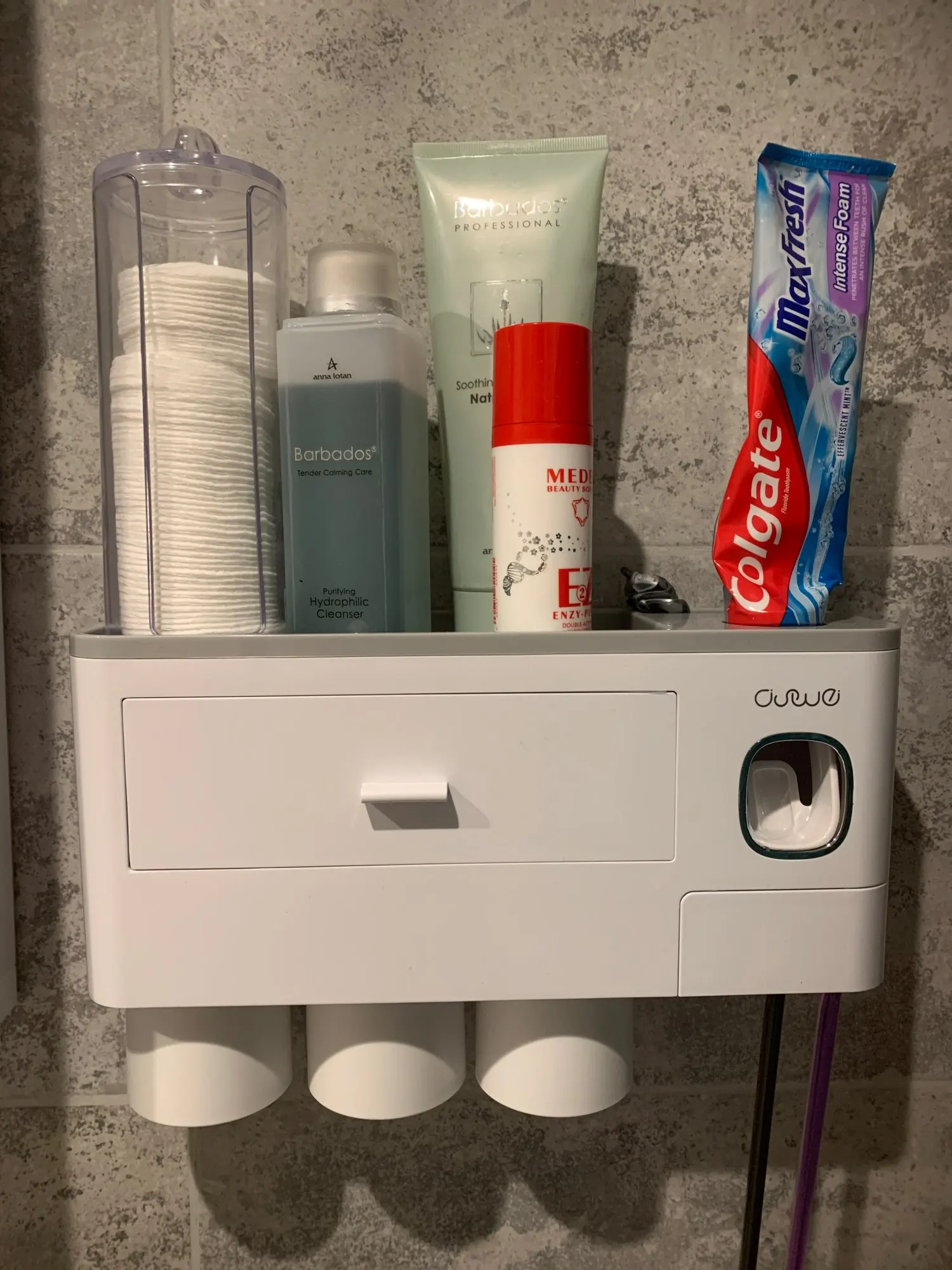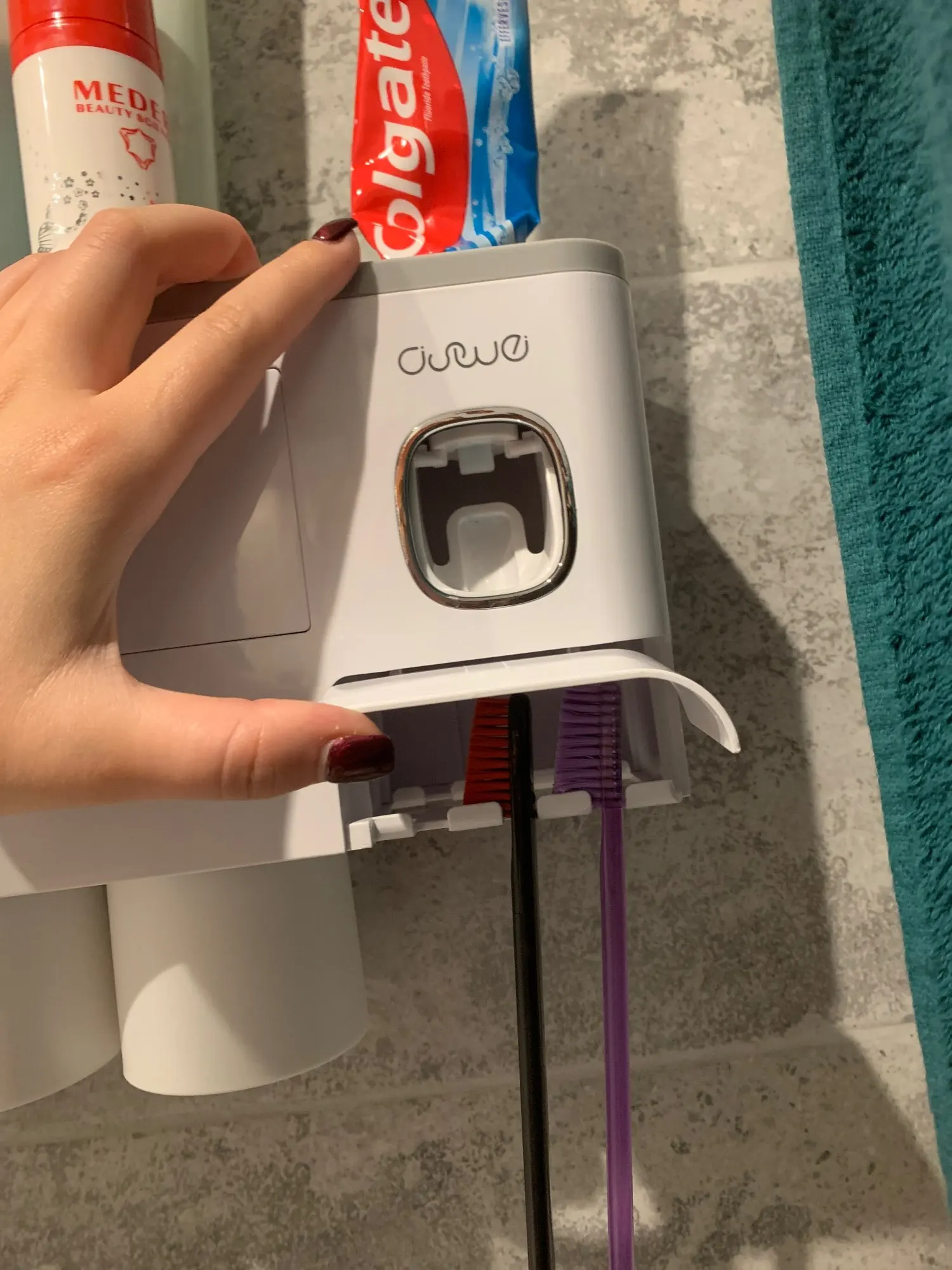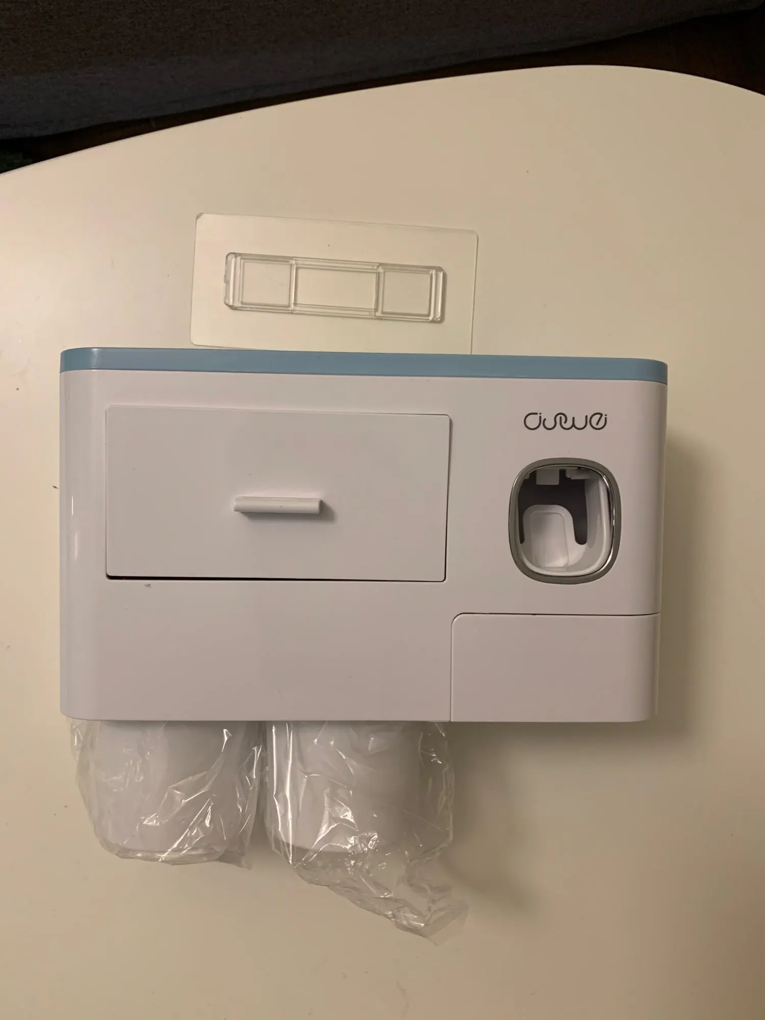 Это здорово. Очень легко установить, сначала я думал, что стикер будет удален с стены при размещении прибора, из-за давления, но это не было. Он очень хорошо цепляется (я оставляет наклейку на стене в течение нескольких минут, на всякий случай, перед установкой). Очень компактный и компактный. Идея подвесить очки с магнитом очень хорошая. Зубная паста прессована и, для заливки пасты в щетку, хорошо дозирует ее. Он не выпадает слишком сильно, слишком быстро или протекает. Он пришел хорошо вовремя и очень хорошо обернут. Без повреждений. Я очень доволен и буду покупать больше у этого продавца.