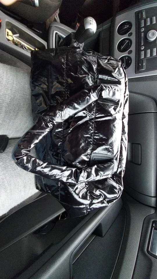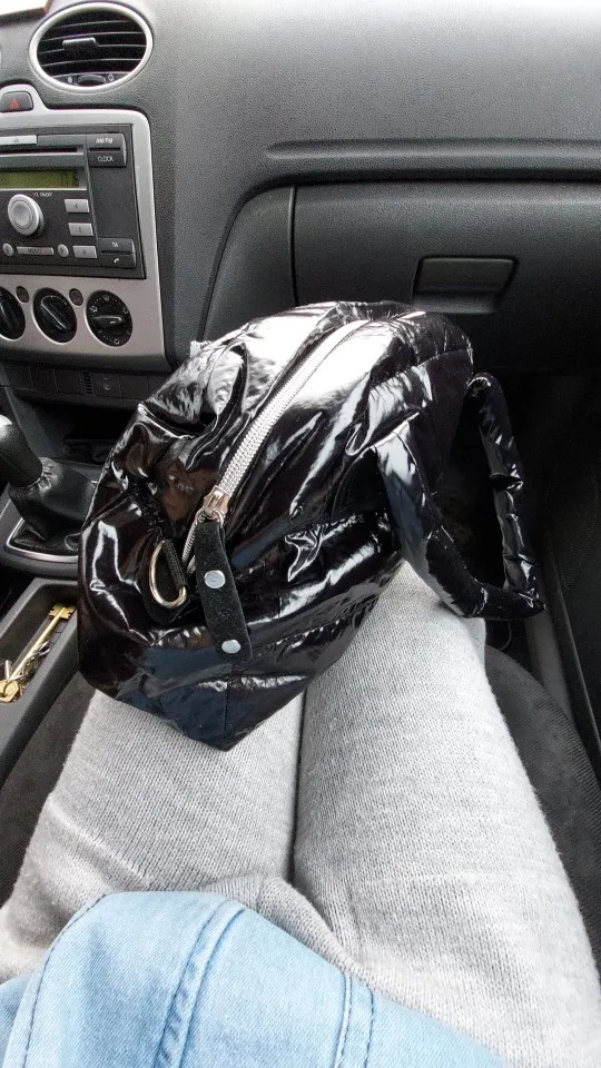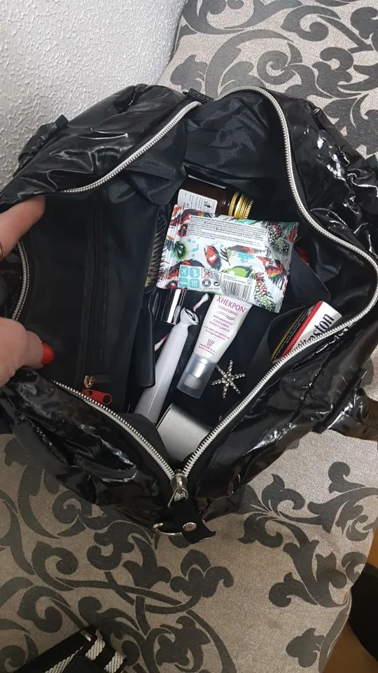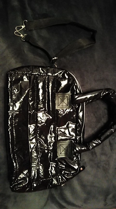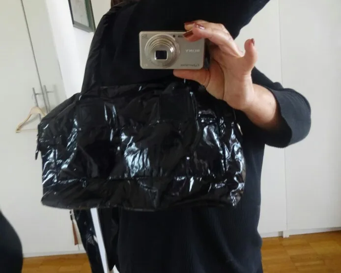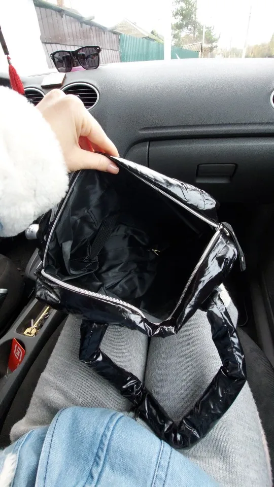 сумка симпатичная, вместительная. Ткань глянцевая. Внутри подклад правда кошмарный. Похож на пакет по шуршанию, но такой плотный пакет. Замки исправны. Внутри 2 странных кармана. Один побольше, другой вмещает в себя 3 пальца (что туда ложат не понимаю) и карман на молнии. Есть ремешок дополнительный. Сумка очень лёгкая