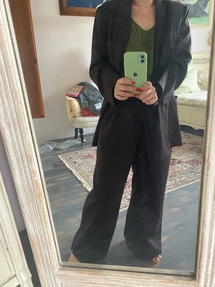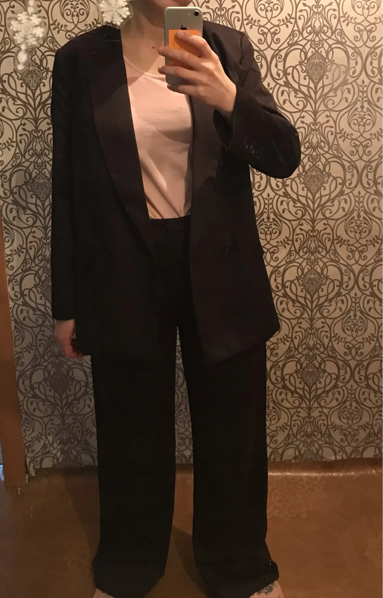 На бедра 105 и талию 74 брюки сели идеально! Пиджак же чуть велик на грудь 92, прям сильно оверсайз - плечи не на месте и топорщатся борты спереди - можно было смело брать М. Качество хорошее. На рост 170 брюки отлично под каблук.