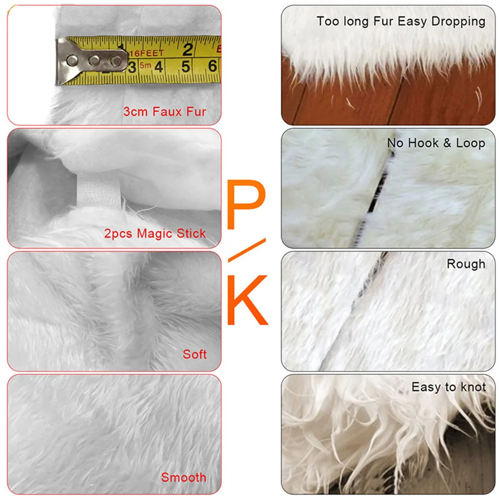 Даже не ожидала, что коврик такой красивый: сшит ровно, очень мягкий, нежный, блестит потрясно! Прекрасно закрывает железную подставку, также можно прятать под ним провода от гирлянды; застегивается на две липучки. Цвет не совсем кипельно белый, скорее молочный (что даже лучше, учитывая, что лежит на полу). Был доставлен за 25 дней, как раз вовремя, трек отслеживался, с продавцом не общалась.