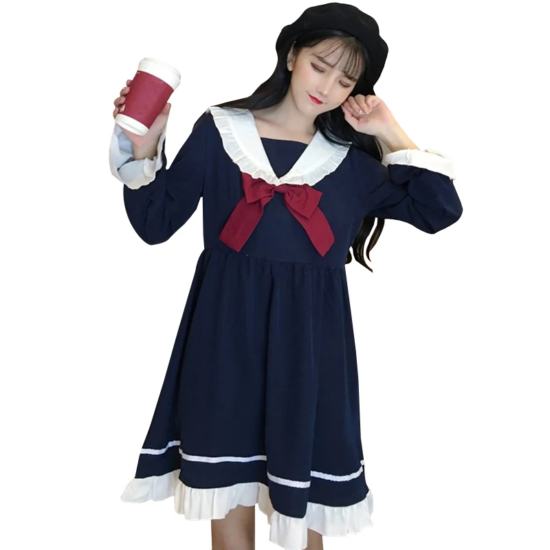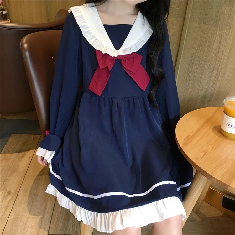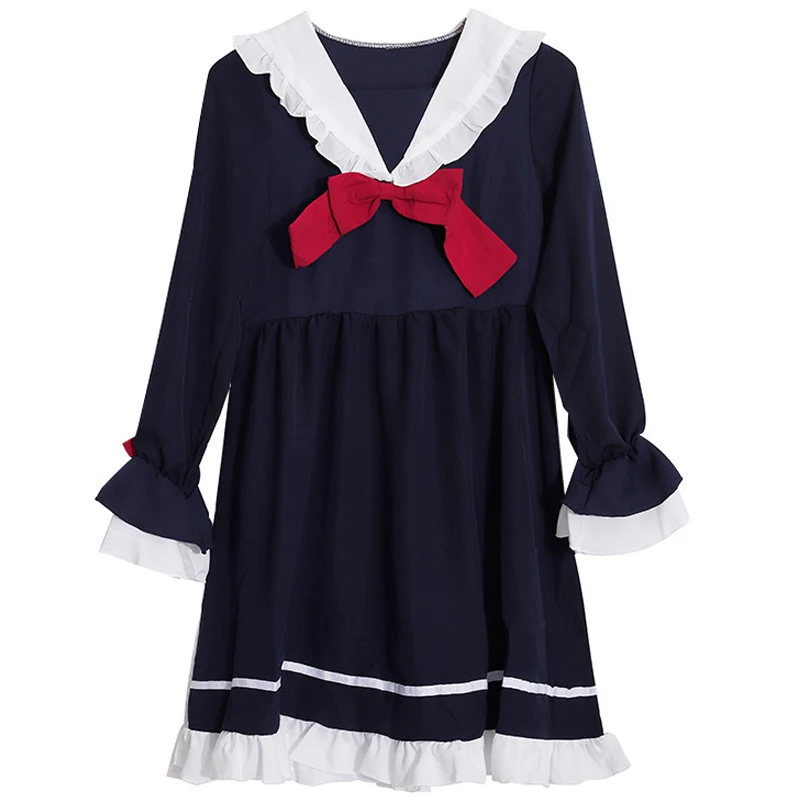 Платье в стиле Харадзюку, красное, с матросским воротником, с оборками, с длинным рукавом