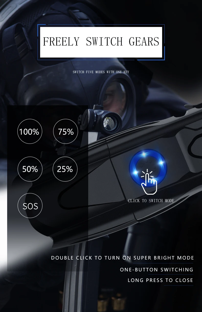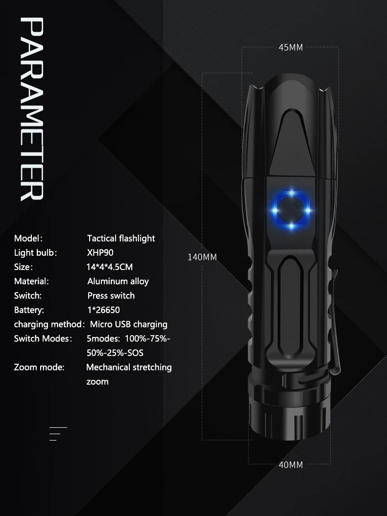Самый мощный светодиодный фонарик с использованием XLamp XHP90 светодиодный фонарик с максимальной мощностью до 8000 люменов (XHP70.2 6000 люменов, XHP50.2 4500 люменов) Используйте 1*18650 или 1*26650 аккумуляторная батарея, различные варианты. Дисплей емкости аккумулятора, телескопический зум Микро-usb для компьютера usb, Автомобильный USB, usb-разъем для зарядки, зарядный фонарик Выход USB 2A 5 В может использоваться как внешний аккумулятор для зарядки телефона Ударный Молоток, который может сломать окна, защитить Изготовлен из авиационного алюминиевого сплава прочный HAIII военный класс Жесткий анодированный Водонепроницаемый в соответствии с IPX-6, водостойкий, может использоваться в дождливую погоду, но не может положить его в воду Подходит для работы, охоты, альпинизма, рыбалки, кемпинга и активного отдыха и т. д. Ударопрочный до 2 метров