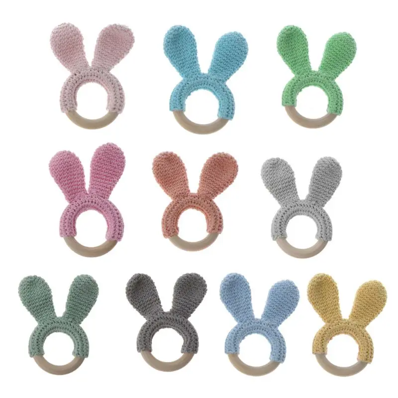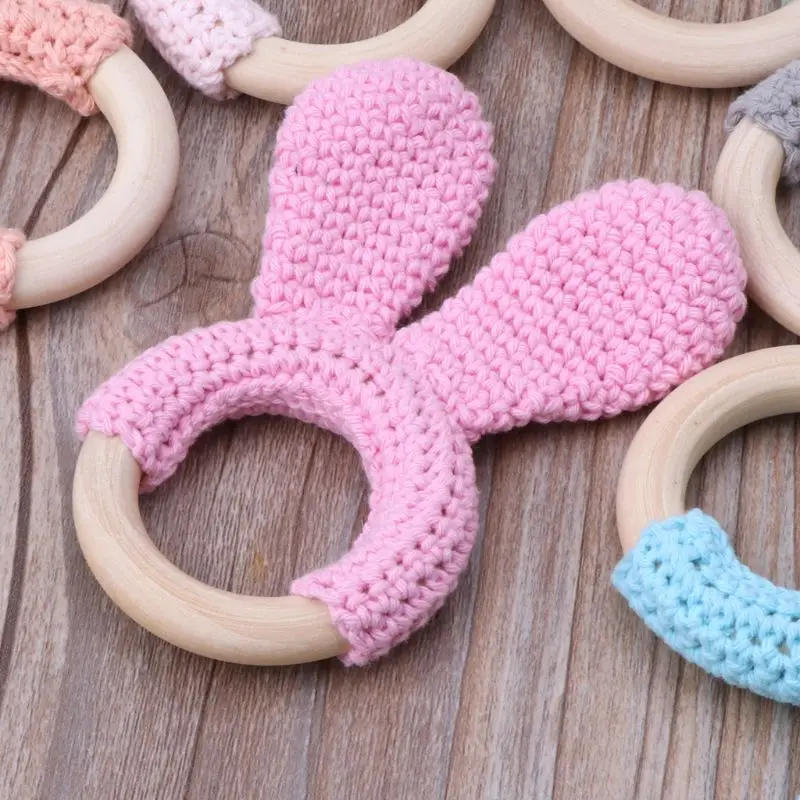 OOTDTY детский Прорезыватель для зубов, заяц, уши, вязаное крючком, деревянное кольцо, безопасная детская игрушка-погремушка для прорезывания зубов