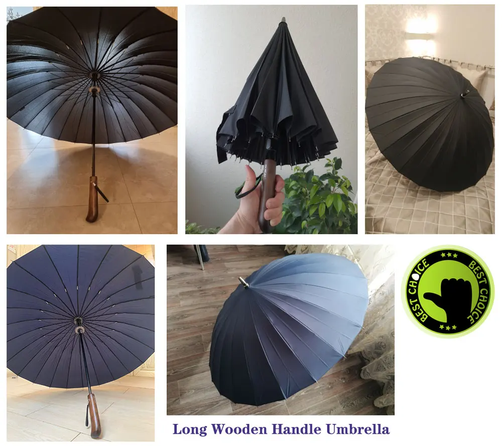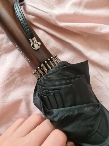 Зонт пришёл заклеенный, весь в защите. Открывается хорошо. Ручка деревянная, удобная.