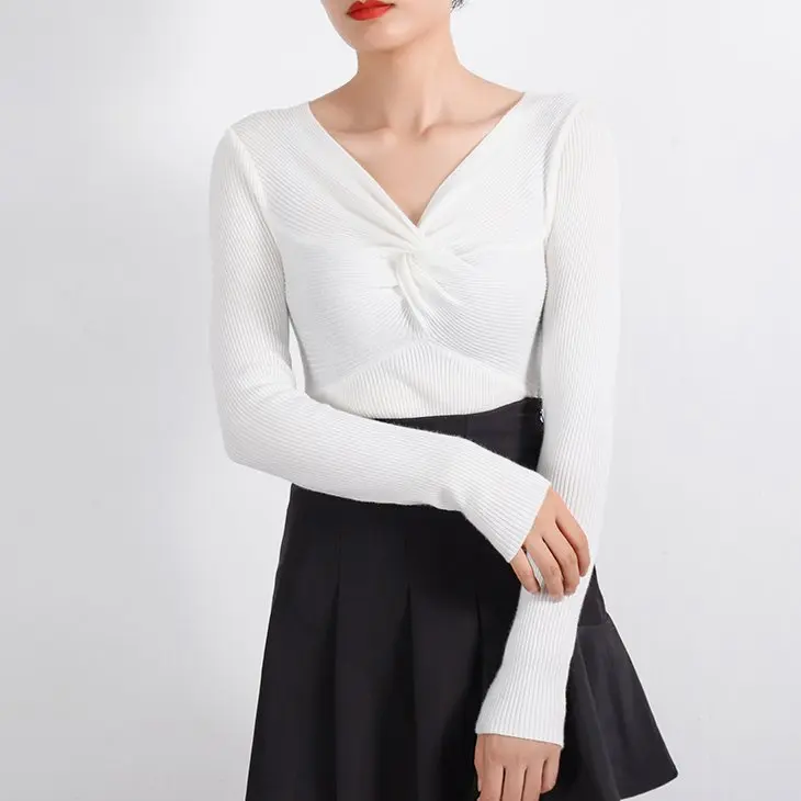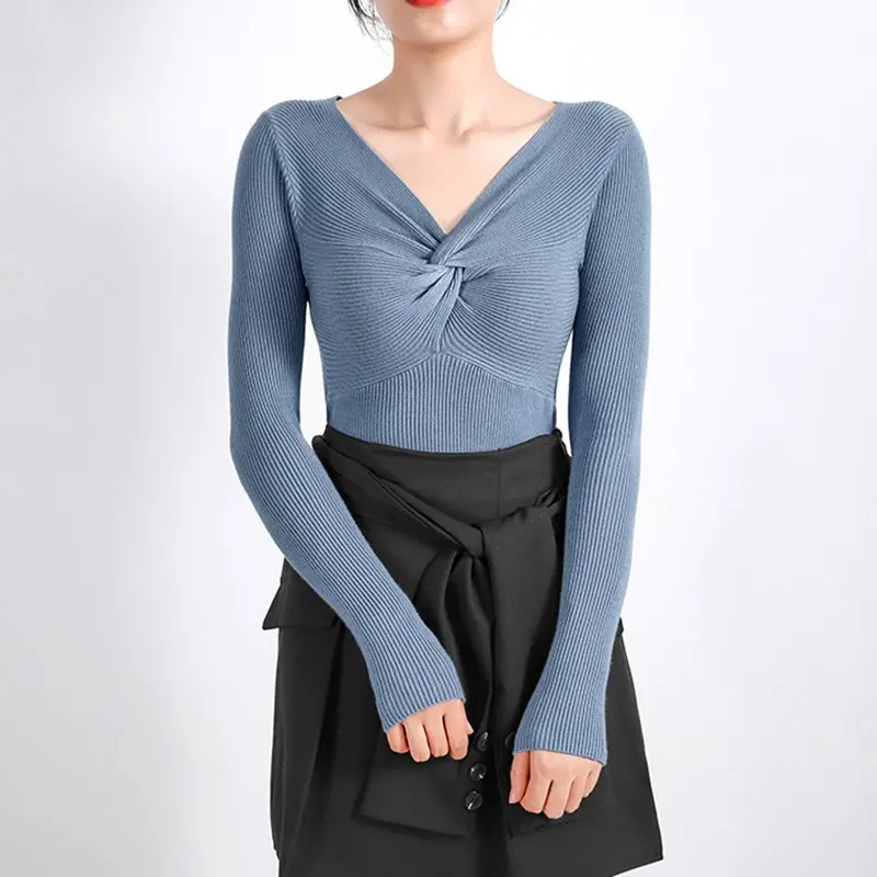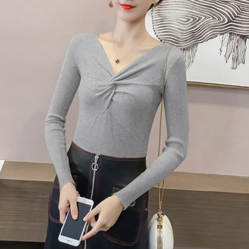Женский трикотажный пуловер с V-образным вырезом и длинным рукавом