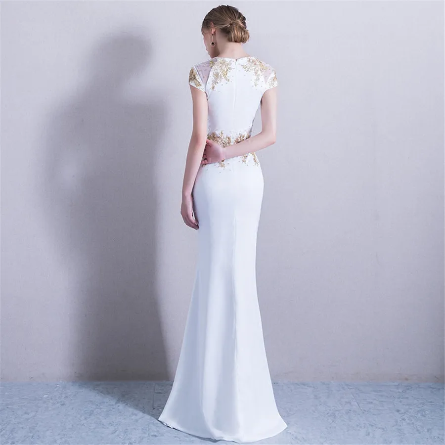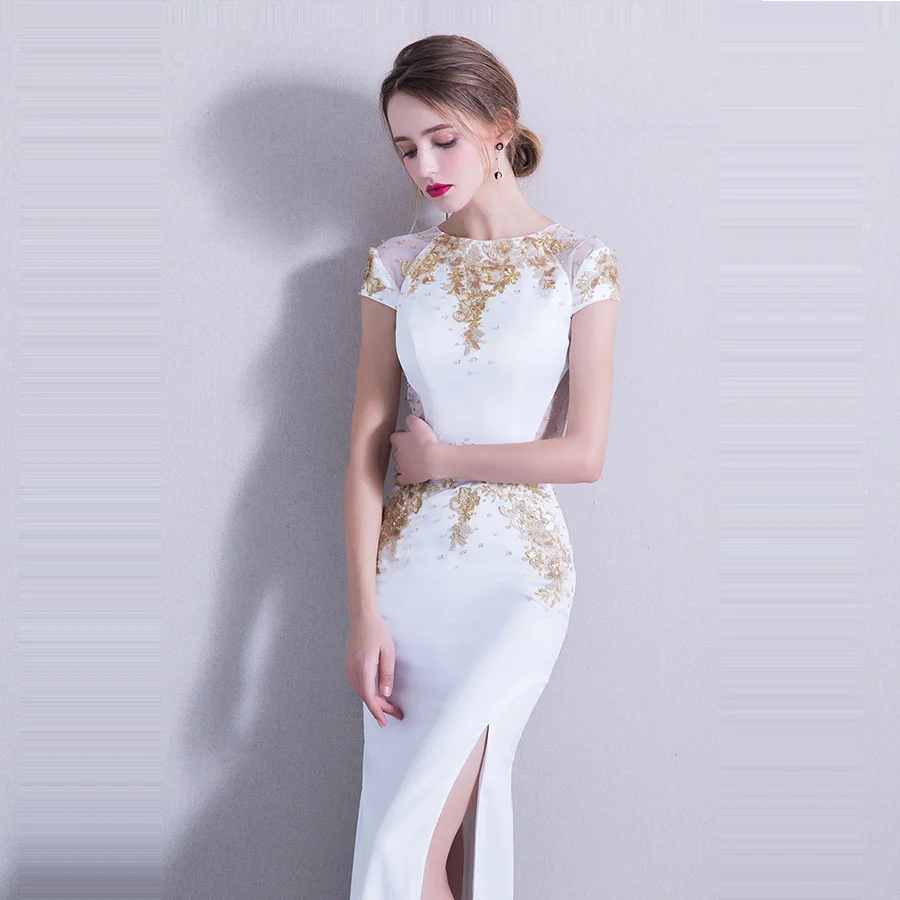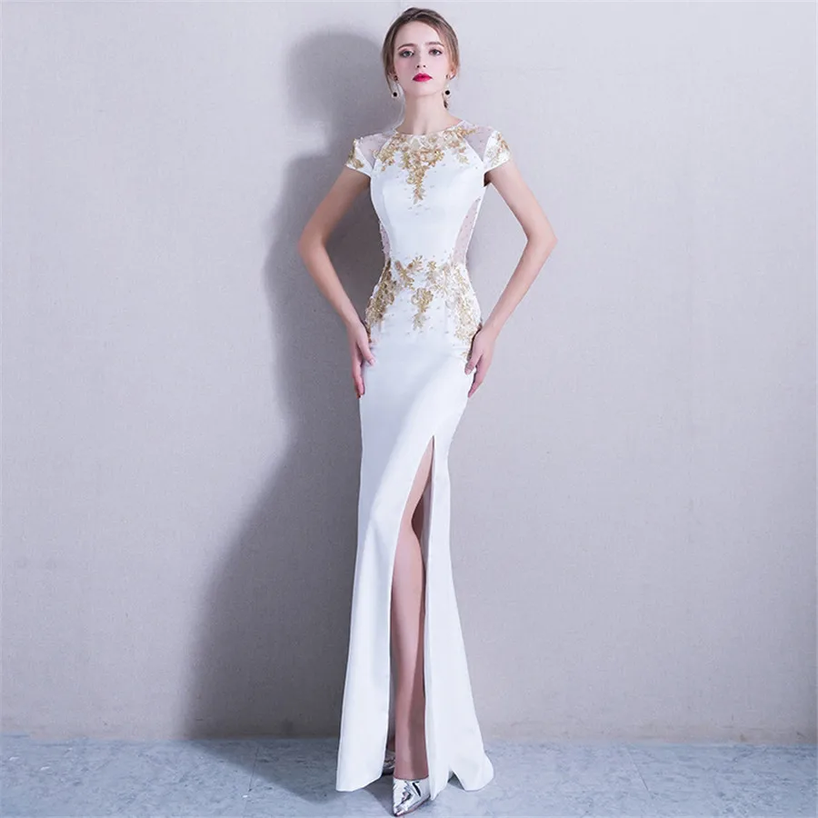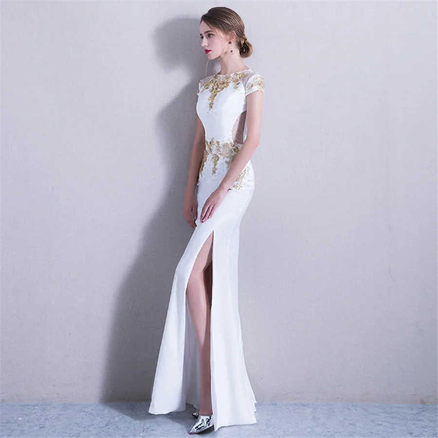 Вечернее платье, белое, с разрезом, элегантное вечернее платье в пол, с блестками, с круглым вырезом, с коротким рукавом, официальное платье, F257, 2019