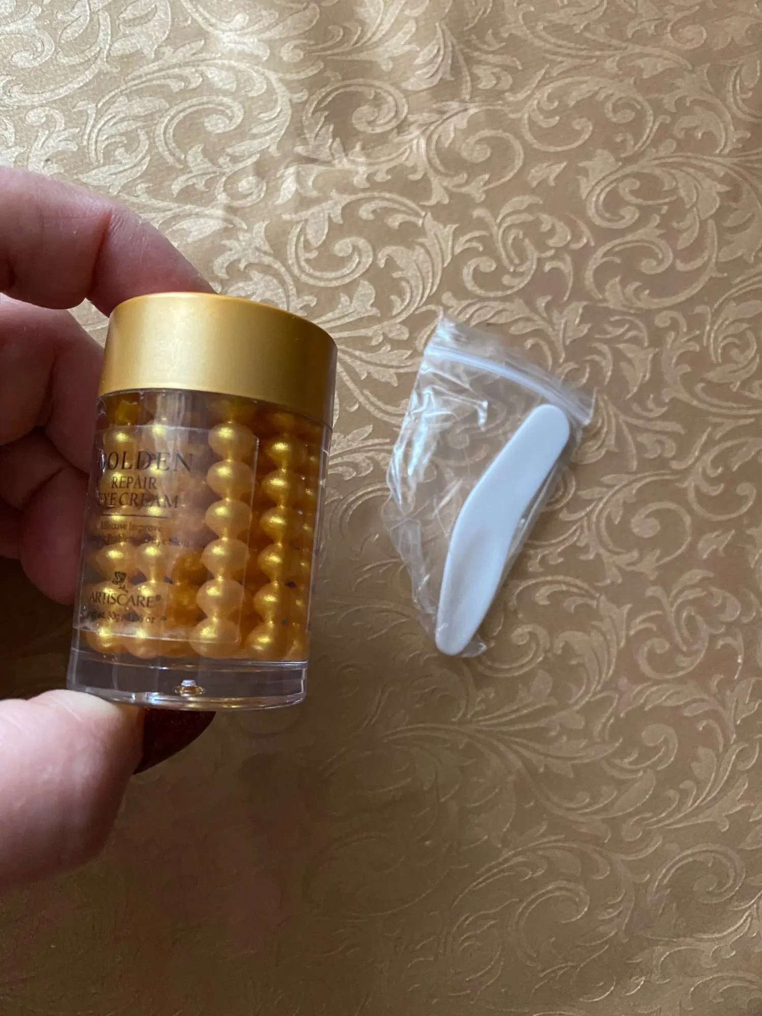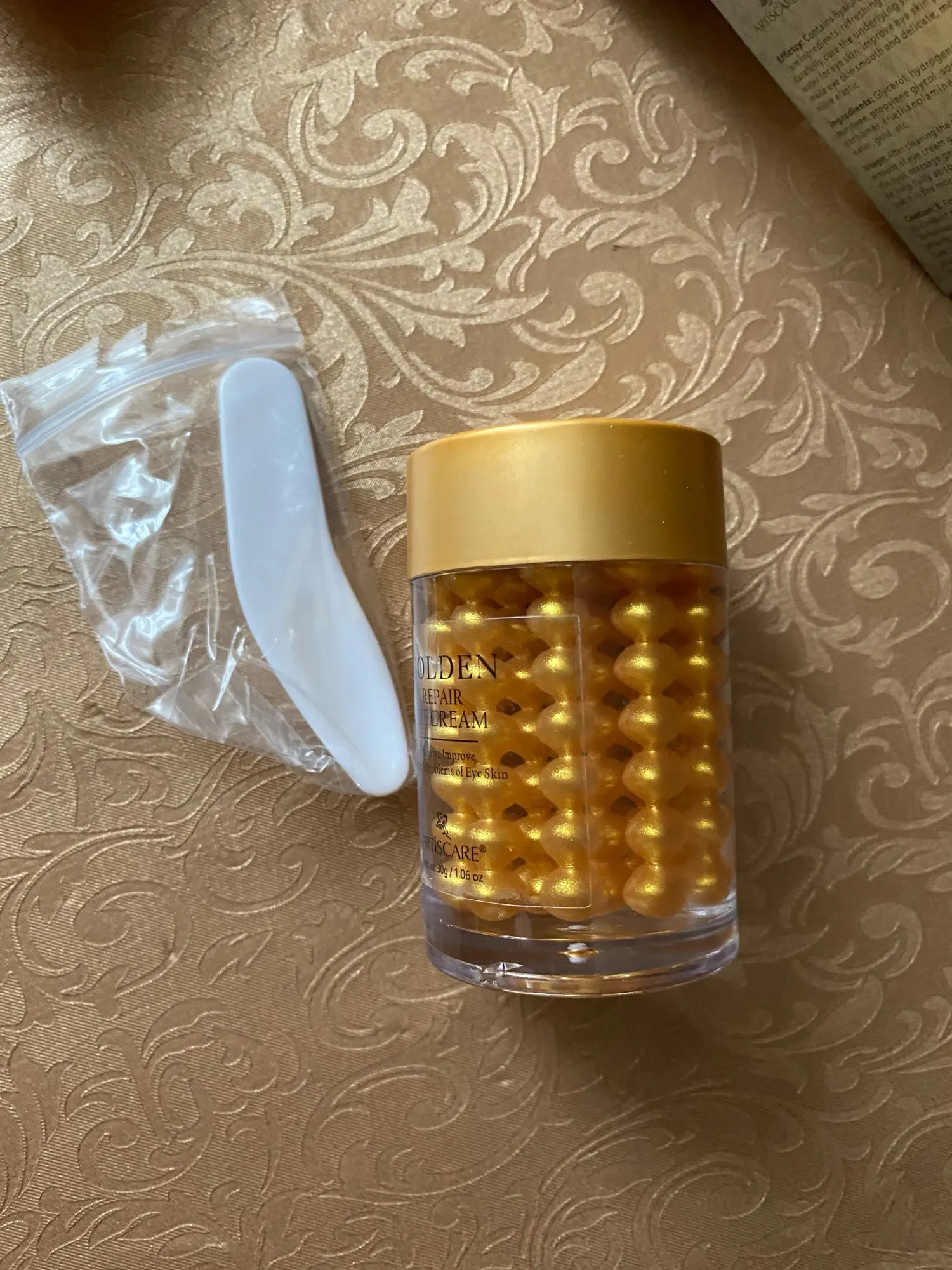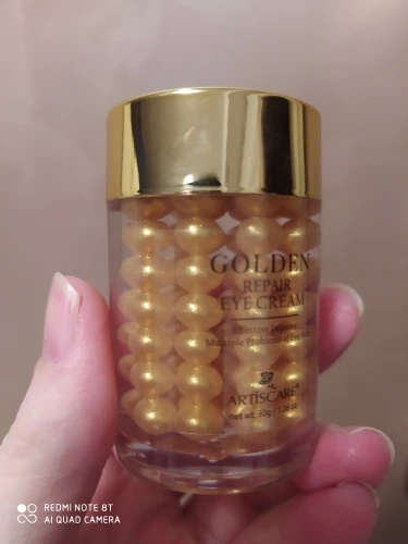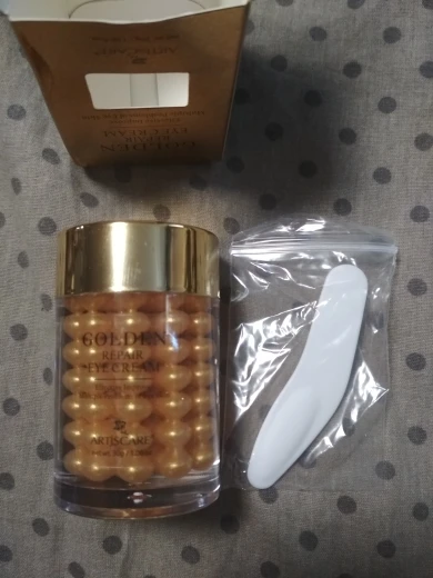 как я поняла,сам крем-это эти золотистые шарики,а жидкость,в которой эти шарики находятся,служит для того,чтоб эти шарики не высыхали и т,д...в комплекте лопаточка,доставать эти шарики,одного шарика мне достаточно,чтобы обработать оба глаза,размазываются хорошо,увлажняют и питают,какой эффект будет в итоге,напишу в дополнительном отзыве,