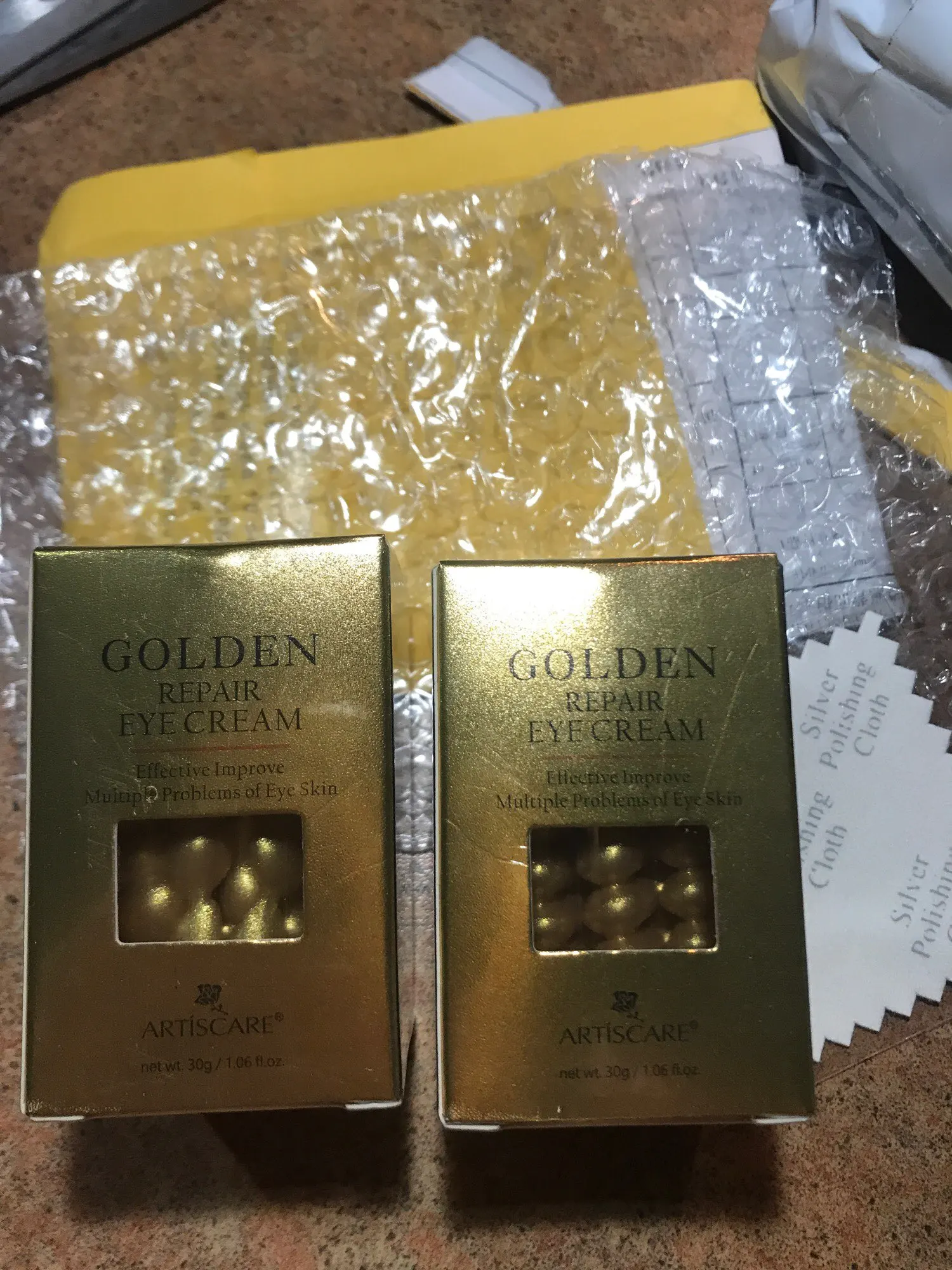 Это не крем, как многие пишут в отзывах, а гель. Взяла на пробу 2 упаковки, но пока впечатления о качестве и содержании не очень хорошие. Золото на коже почти не остаётся. Посмотрим на результат - если будет вау-эффект с радостью с вами поделюсь и дополню отзыв. Посылка шла очень долго, пришла в офис СДЭК (они не информировали о доставке неделю, если не больше), коробки все мятые, содержимое целое. Поэтому для собственного пользования вполне подходит, а на подарки, как многие пишут, могут не подойти по эстетическим соображениям. Продавец хороший, вежливый - рекомендую! Следите за купонами продавца - можно прилично сэкономить на покупках. Всем хорошего шопинга!