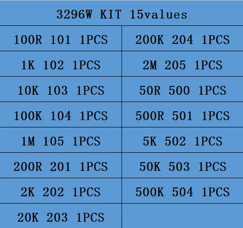 15valuesX1pcs = 15pcs 100ohm-2Mohm 0,5 Вт 3296 3296 Вт переменные резисторы многооборотный Подстроечный резистор регулируемый прецизионный набор потенциометра