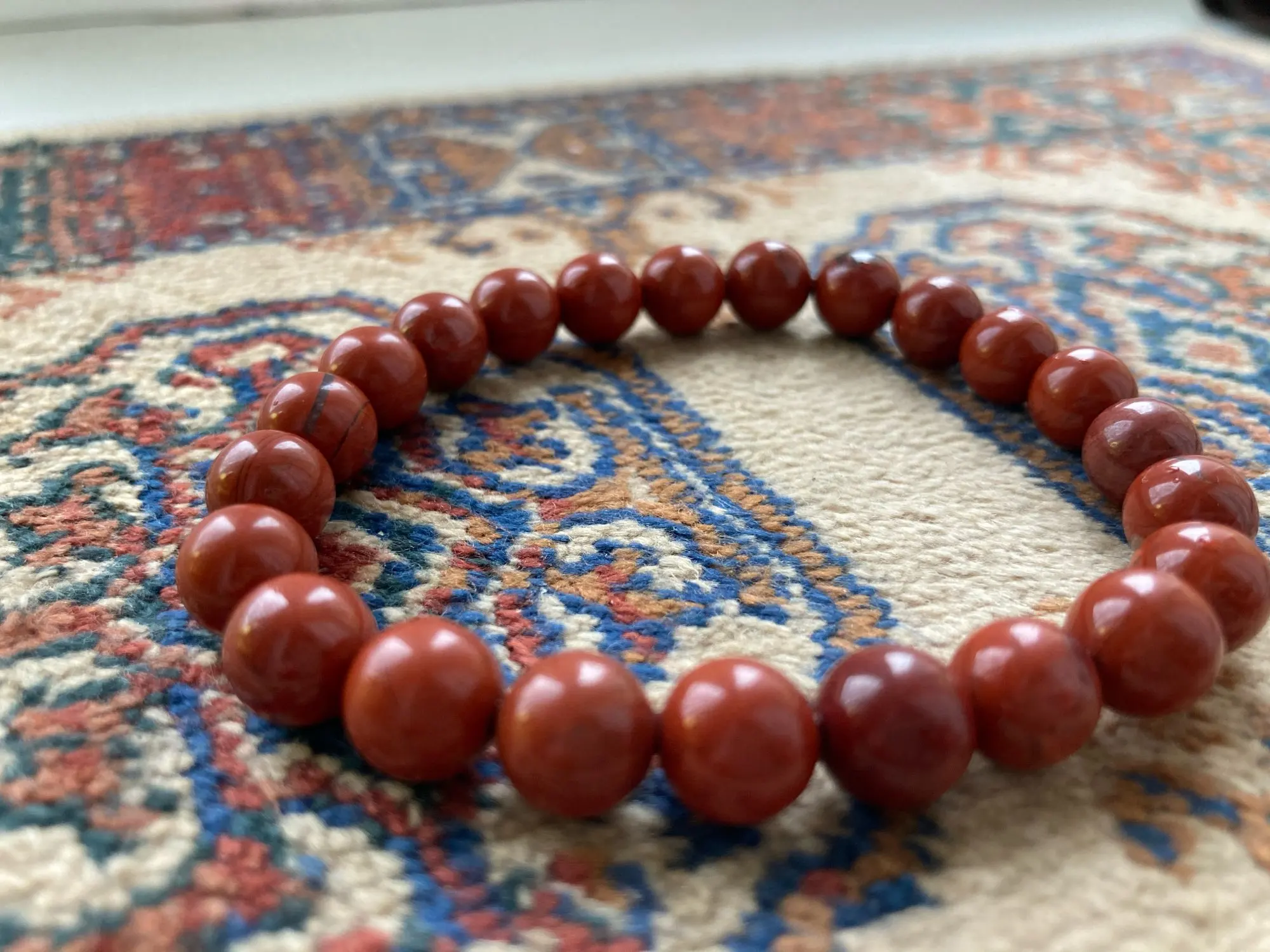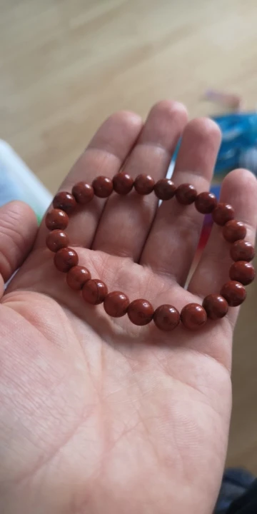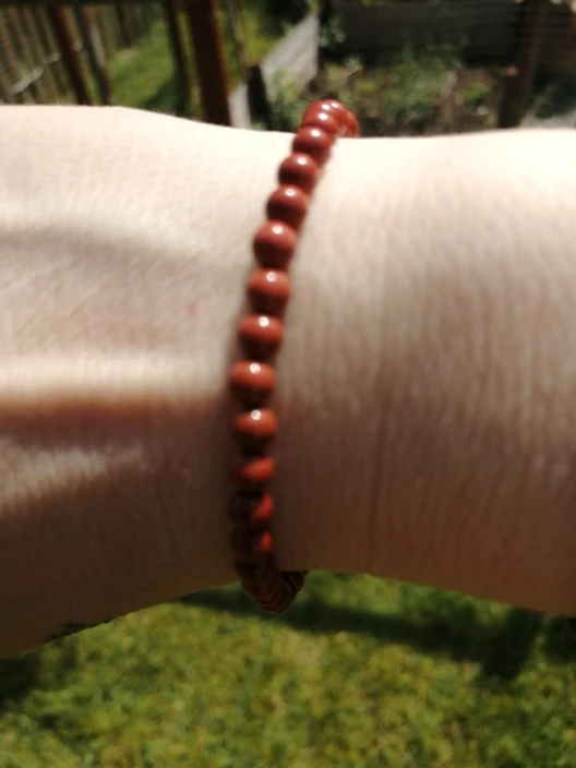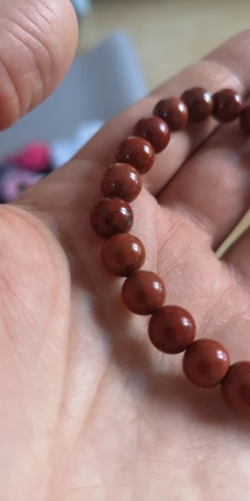 Это красивый браслет. Яшма немного более коричнево-красного цвета, но это говорит о его geniunity. Я сравнил его с red jasper, который у меня уже есть, и я уверен, что это действительно. Я рекомендую его.