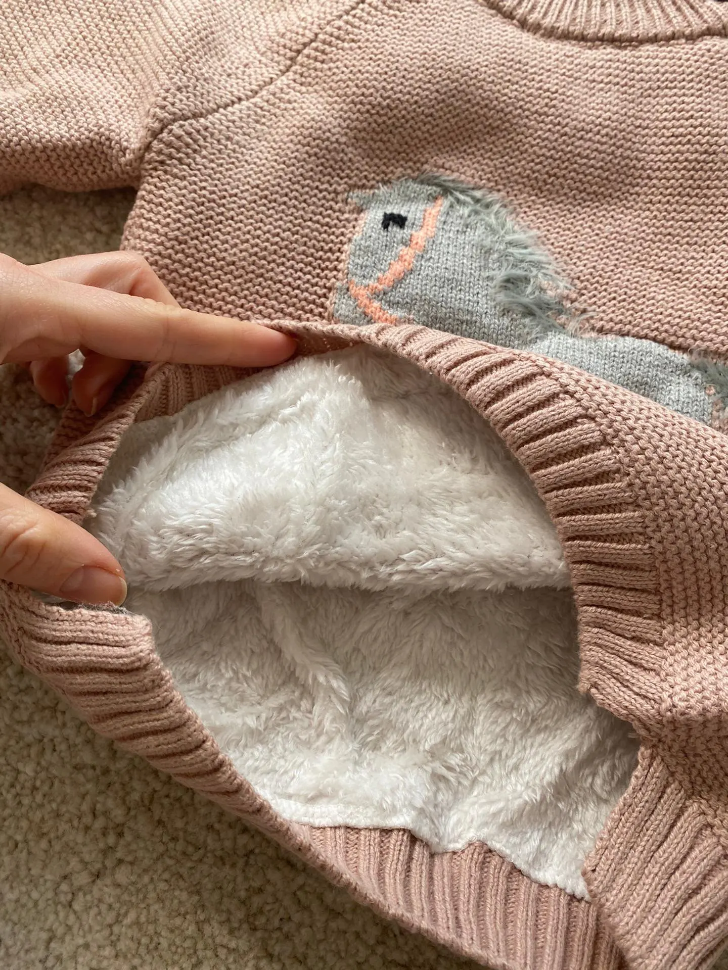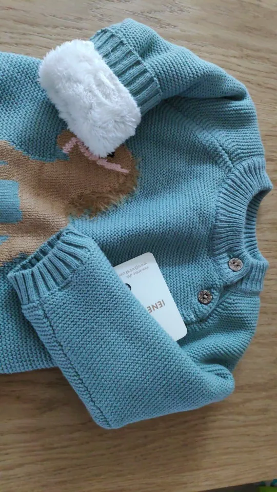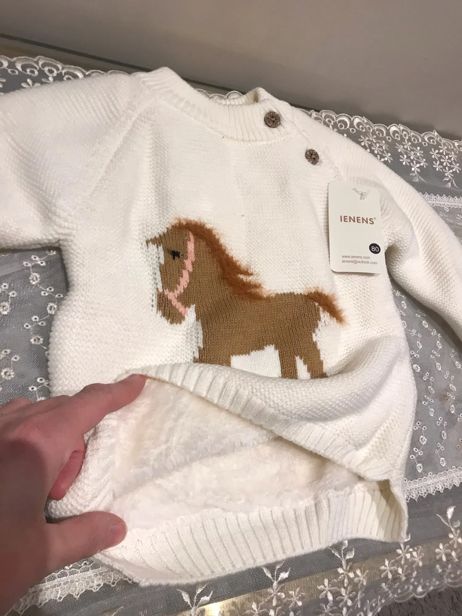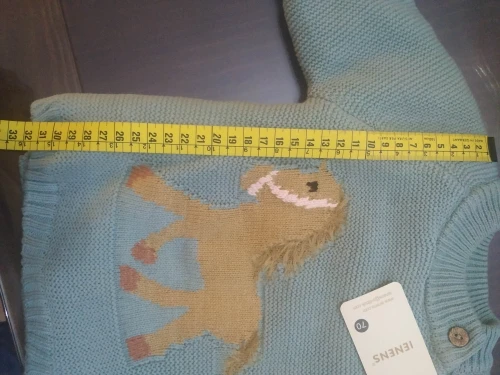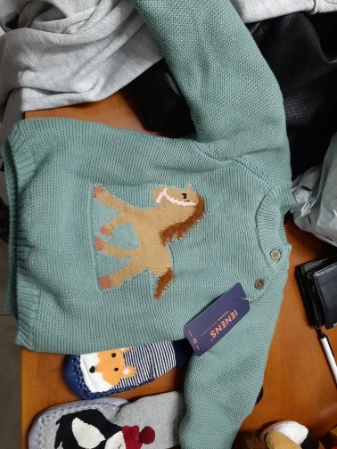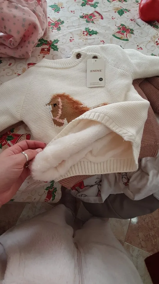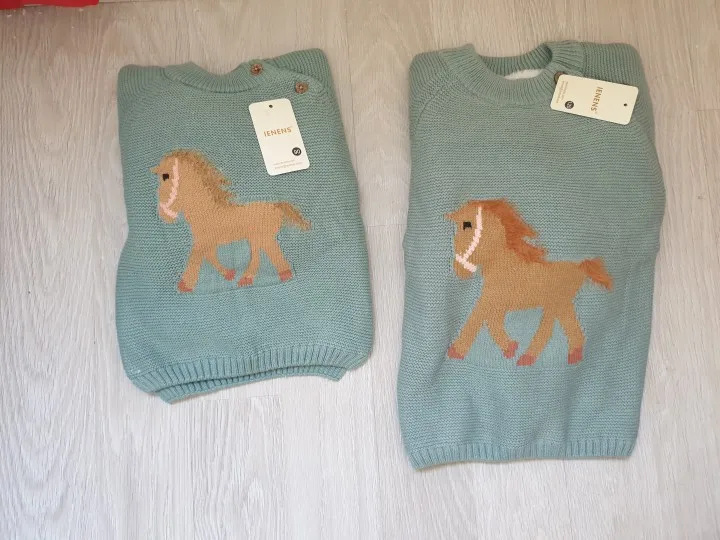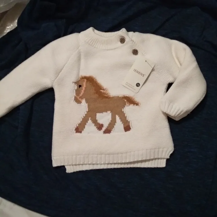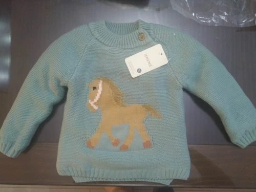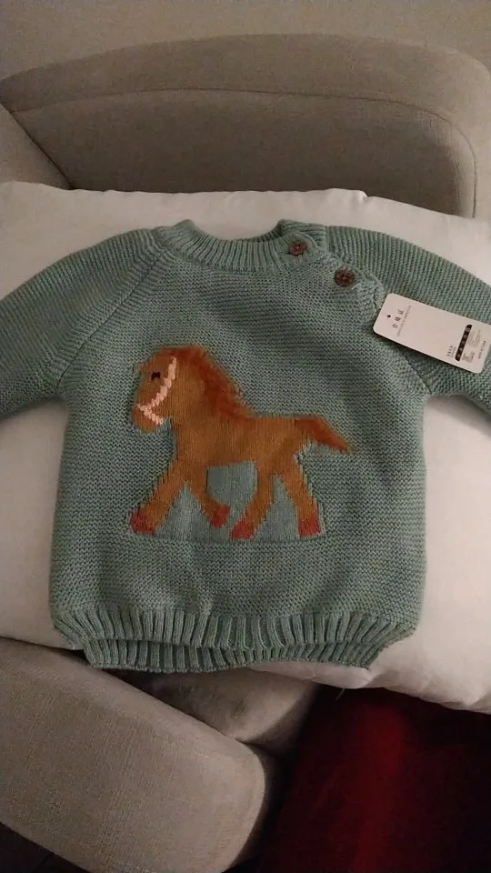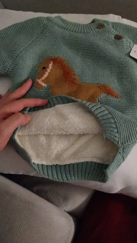 ОГРОМНОЕ спасибо продавцу, который пошёл навстречу и поменял размер. Свитерок с биркой 80, где-то на годик. Грива и хвост у лошадки чуть лохматятся, что придаёт натурализм изображению. Реально тёплый, тянется.Изнутри пушистая ткань и в рукавчиках тоже. Наверное, ПОД свитерок нужна х/бумажная футболочка.
