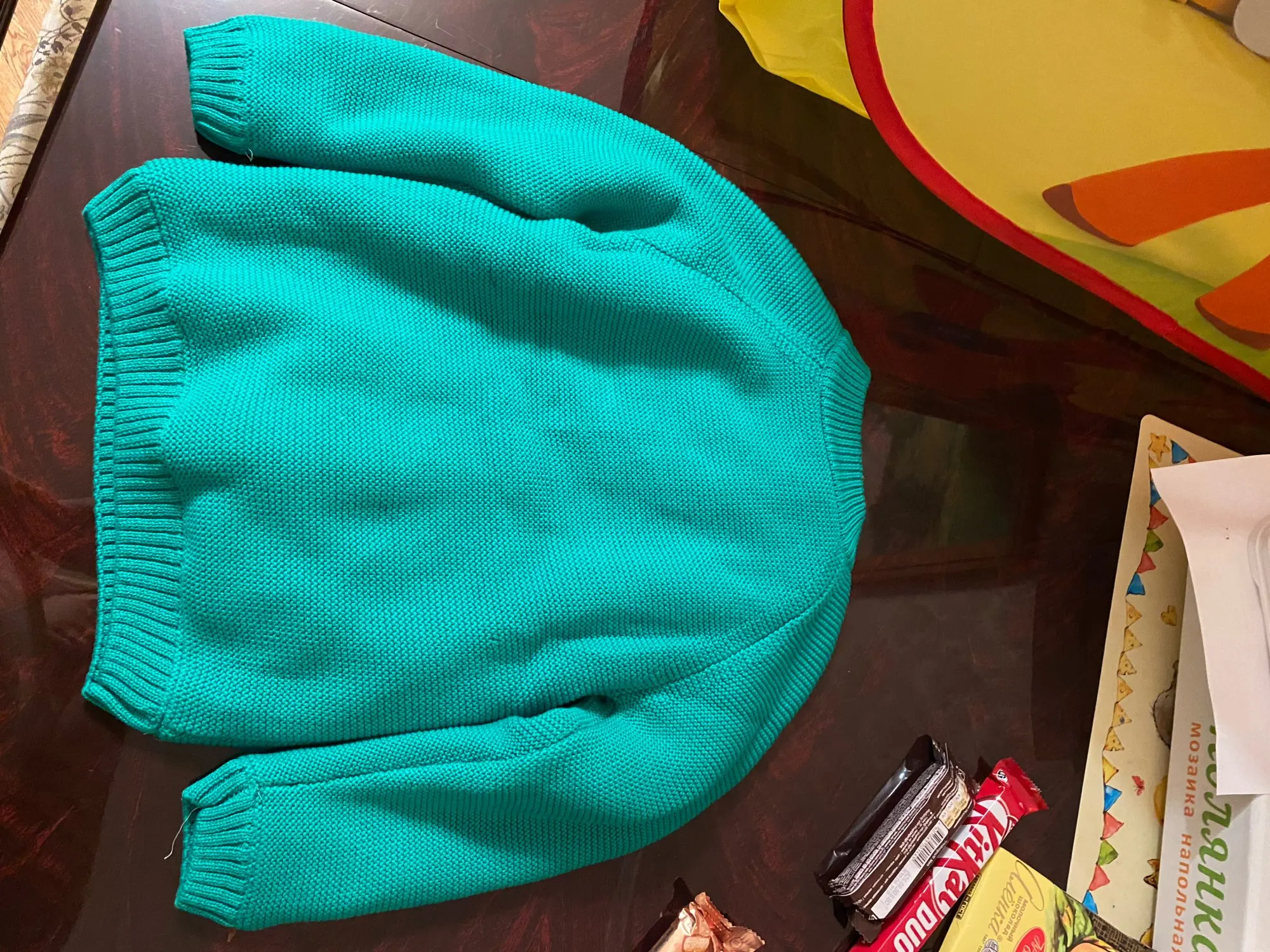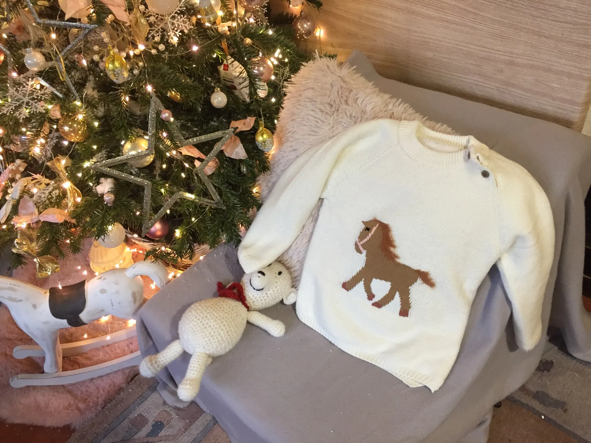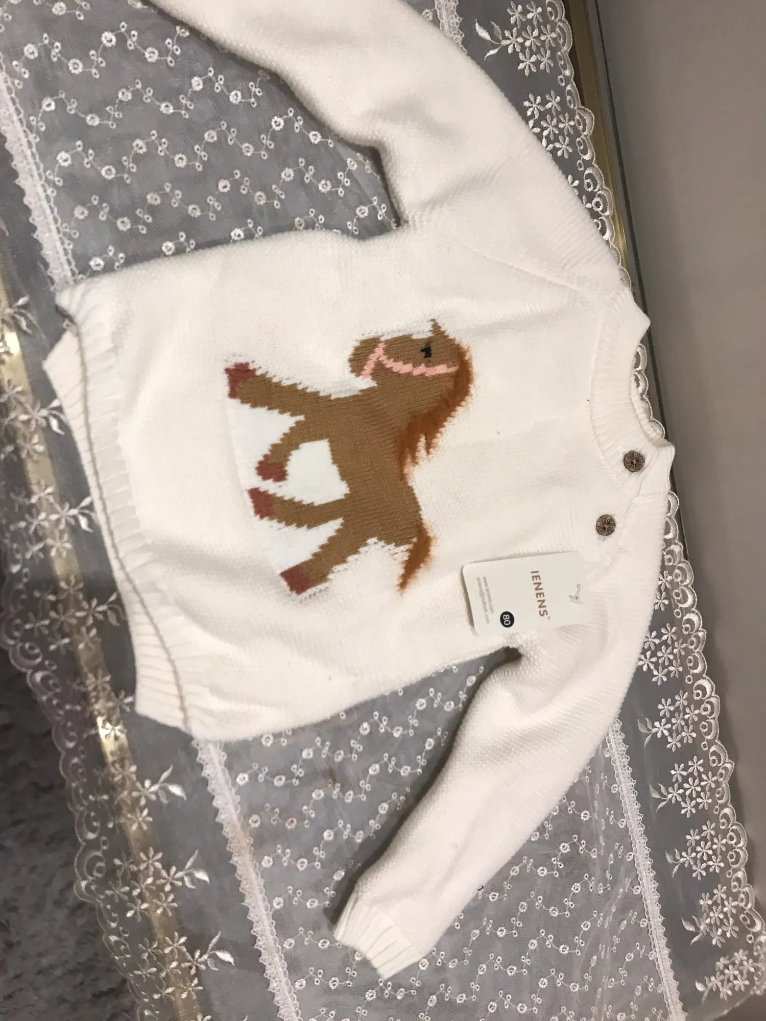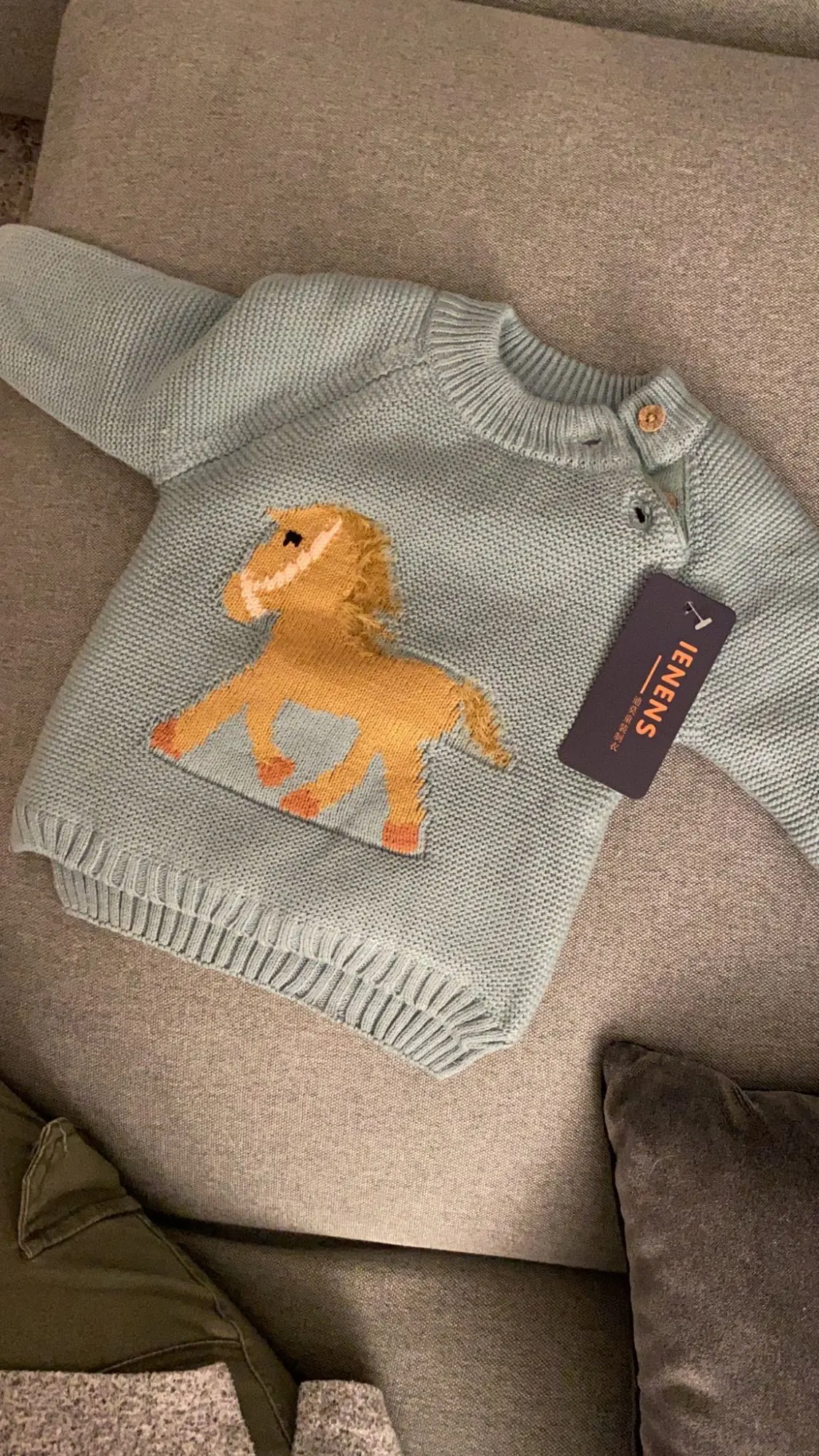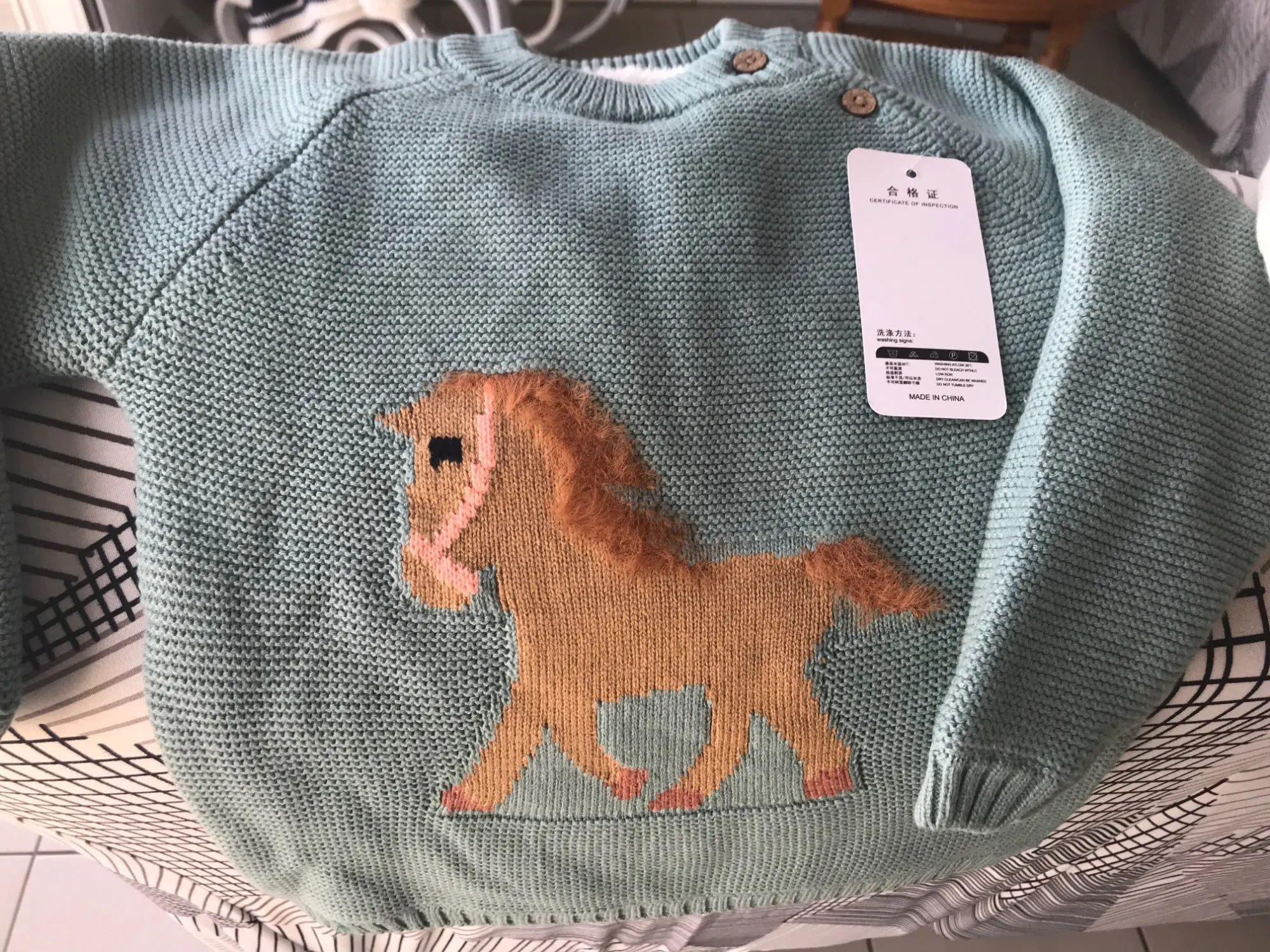 ОГРОМНОЕ спасибо продавцу, который пошёл навстречу и поменял размер. Свитерок с биркой 80, где-то на годик. Грива и хвост у лошадки чуть лохматятся, что придаёт натурализм изображению. Реально тёплый, тянется.Изнутри пушистая ткань и в рукавчиках тоже. Наверное, ПОД свитерок нужна х/бумажная футболочка.