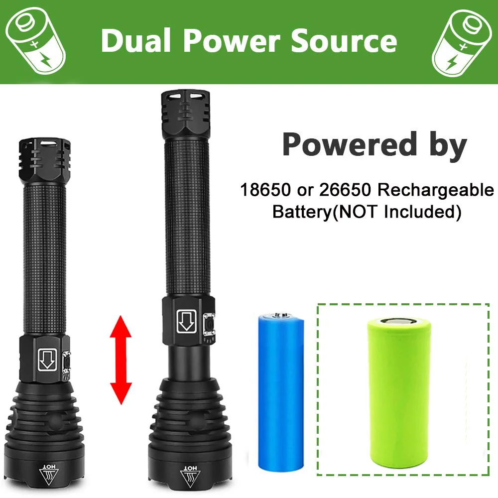 ★Светодиодный светильник: XHP50 ★5 режимов: 100% освещение-70% освещение-50% освещение-вспышка SOS ★Материал: алюминиевый сплав ★Переключатель: нажмите переключатель ★Режим зарядки: зарядка через USB ★Расстояние освещения: выше 300 метров (1000 футов) ★Светодиодный срок службы: более 100000 часов ★Аккумулятор: 1*18650/1*26650(Не входит в комплект)