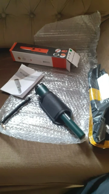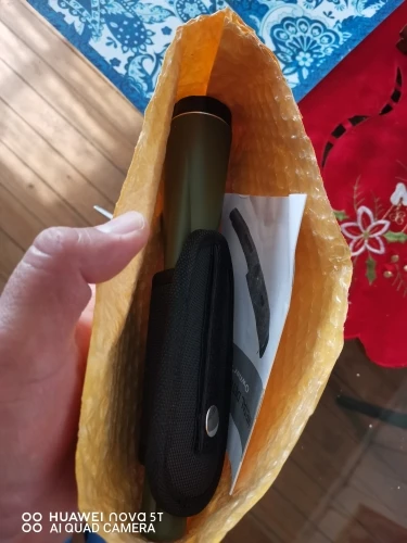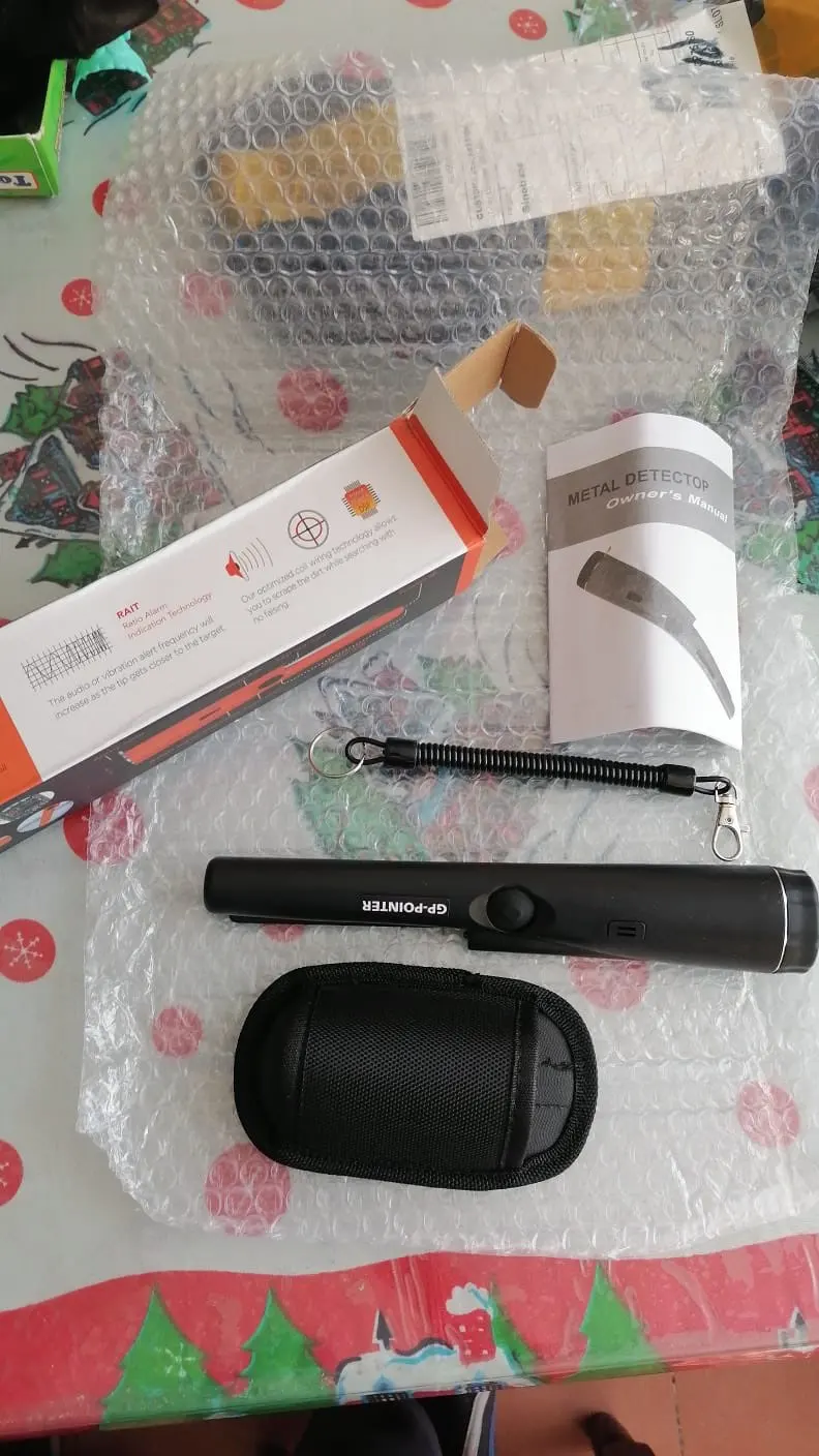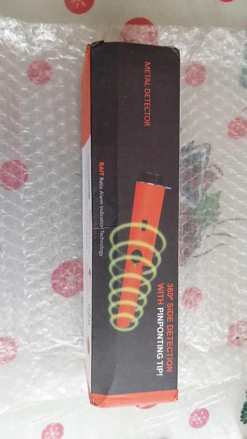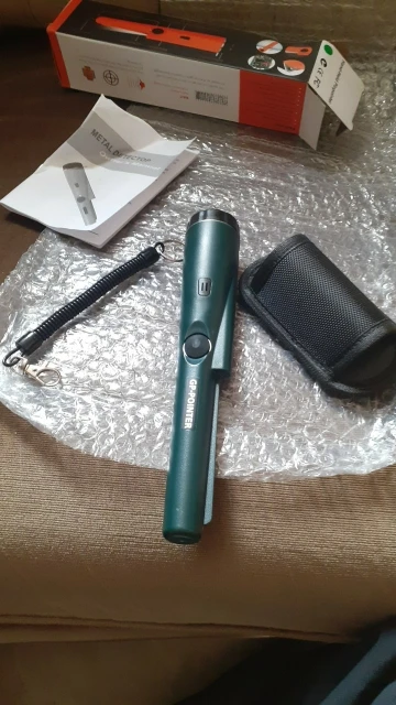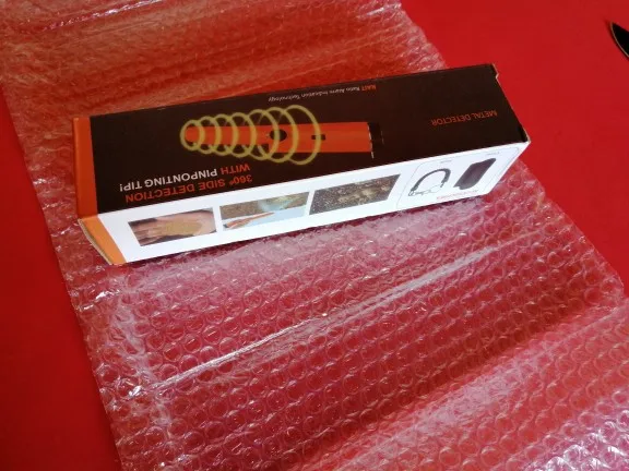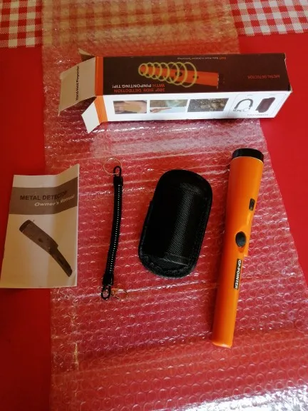 упаковано не очень, коробка помята, товар целый. питается от одной батарейки крона. в комплекте чехол, шнурок, инструкция на английском. по пути с почты купил батарейку, установил, на предметы крупные реагирует неплохо, на колечки на шнурке металлические не реагирует. есть фонарик, но очень слабый, качество пластика дубовое.... за 1 тыс руб наверное нормально... пришло достаточно быстро, посылка отслеживалась.