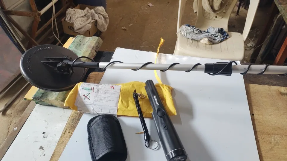 Обнаруживает металл на расстоянии 4-5 см. Нам не нужно ждать слишком долго. Арас идет с грузом.