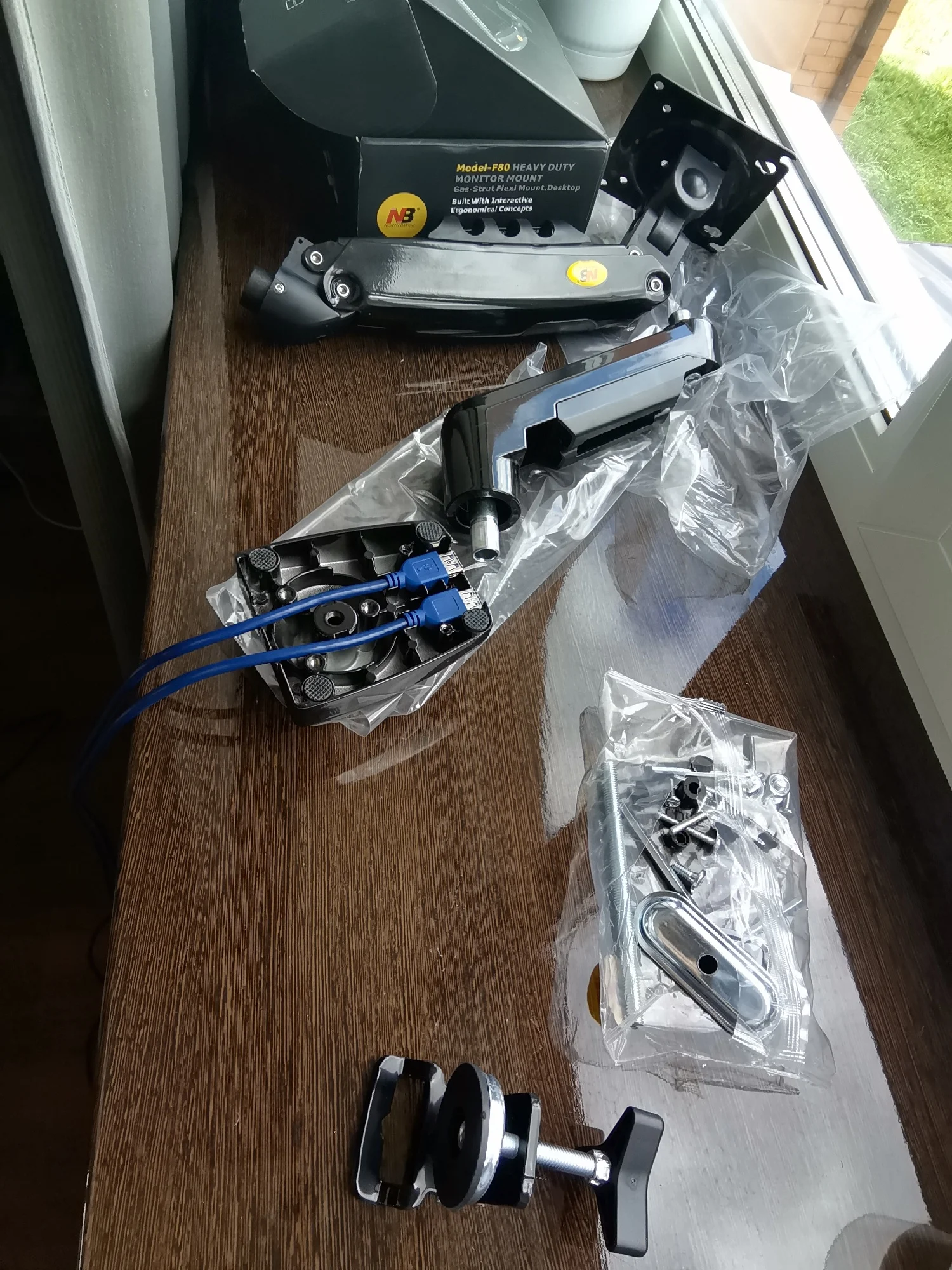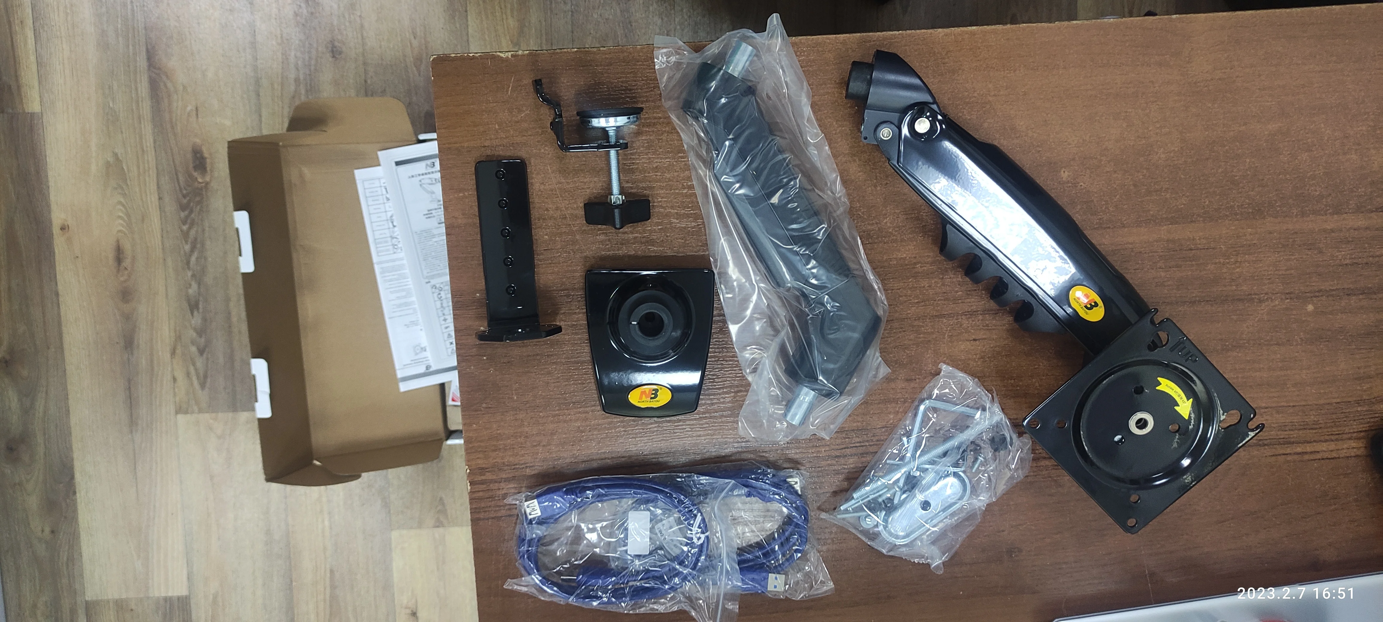 Доставка в течении недели. Держатель сделан качественно, железо крепкое, собрался без проблем, регулировка наклона удобная, USB удлинители реботают, крепление к столу двух видов просто струбцина и со сверлением отверсия, на свое усмотрение. Монитор 27 дюймов держиит хорошо, не падает. Монитор 32 дюйма вешать не пробывал.
