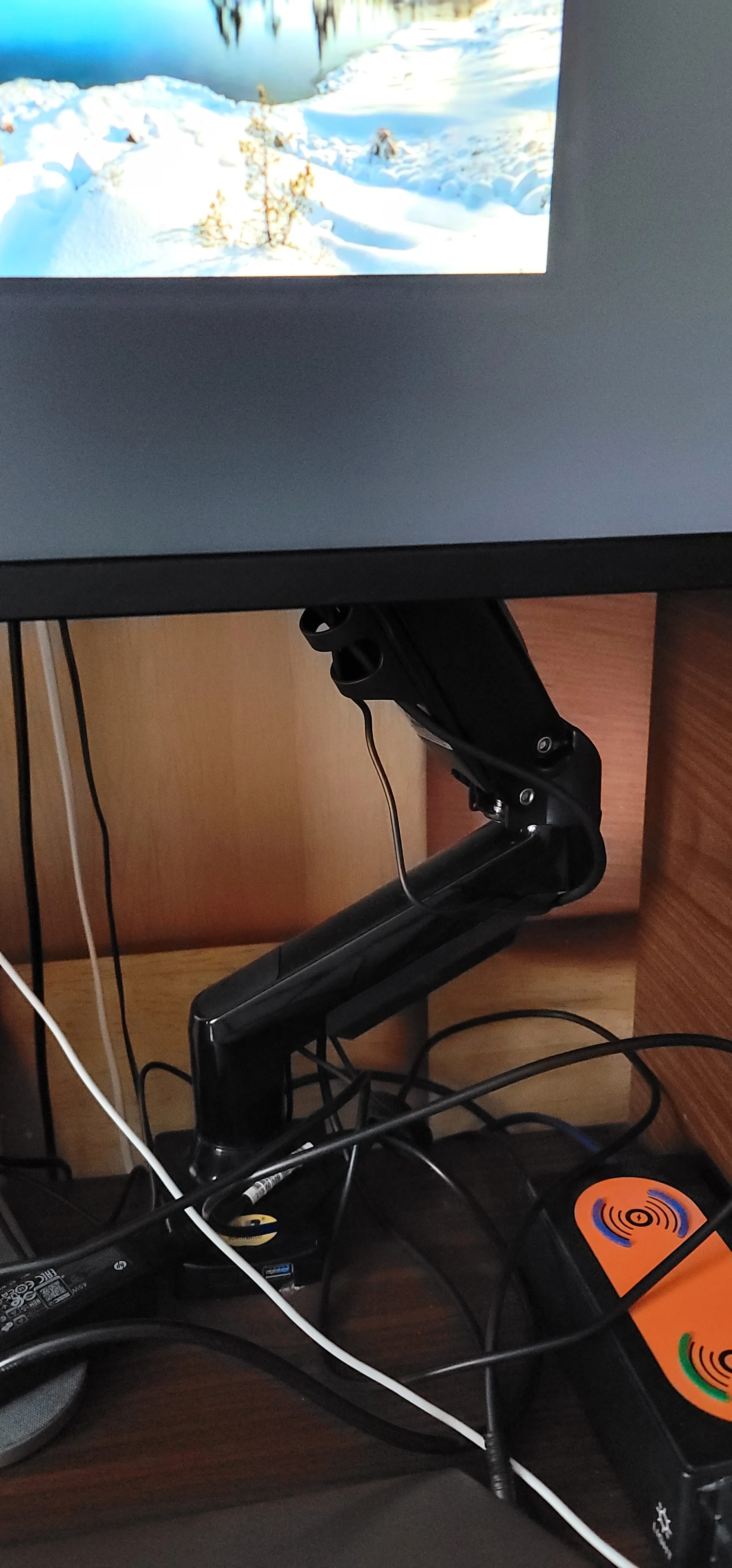 Отличный и удобный кронштейн с продуманной регулировкой и удобной системой крепления. В станину можно вмонтировать пару кабелей, что идут в комплекте. Все кабели аккуратно укладываются. Газлифт нужно подстроить под вес монитора, для этого используется винт в основании второго рычага, доступ к нему - сверху.