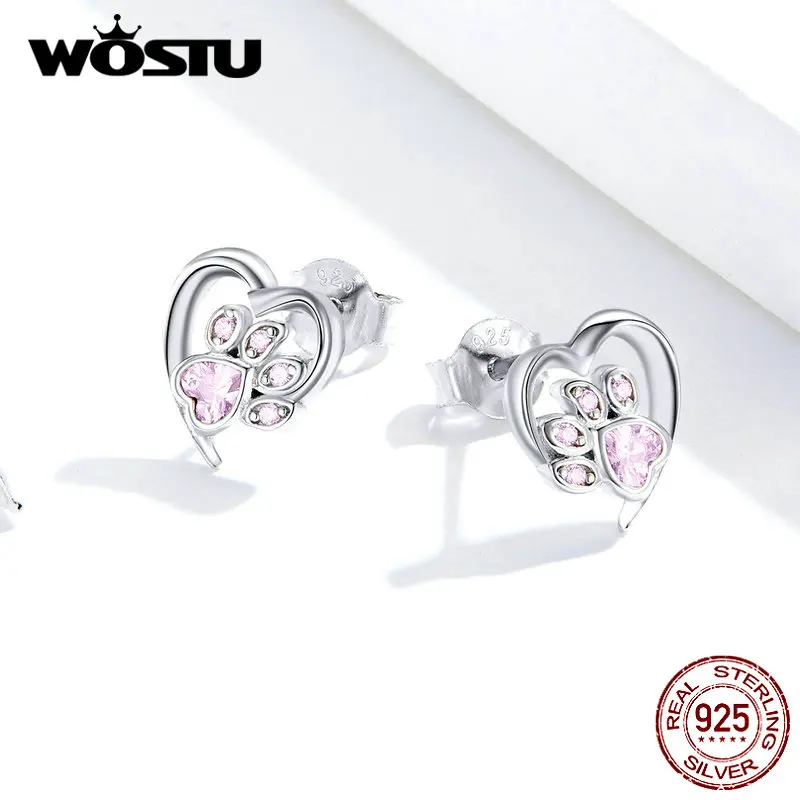 WOSTU 925 пробы, серебряные серьги-гвоздики в форме лапы собаки, сердца, для женщин, розовый циркон, свадебные маленькие серьги, ювелирное изделие, CQE654-PK