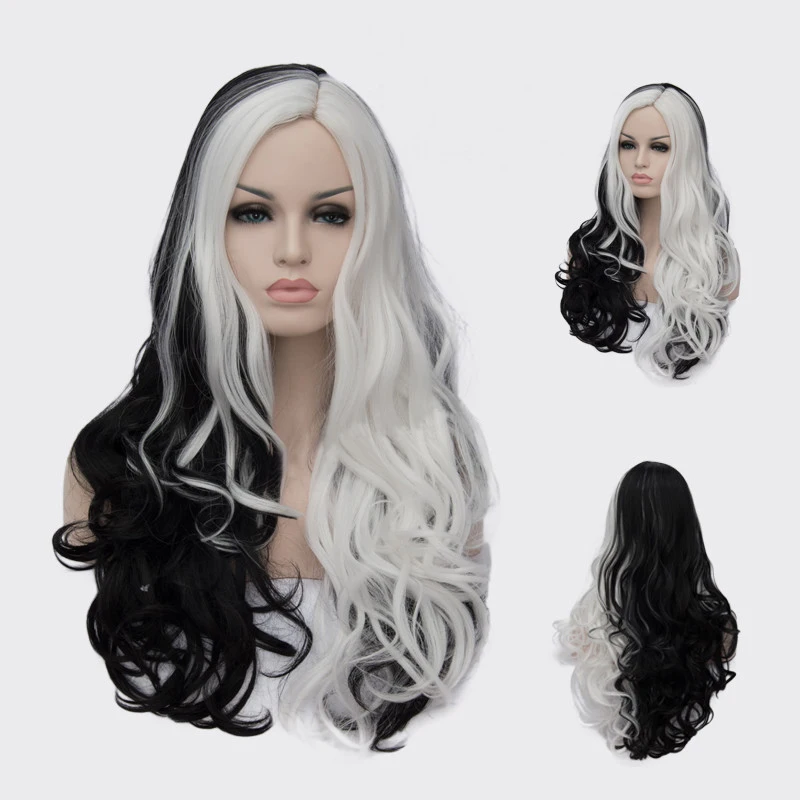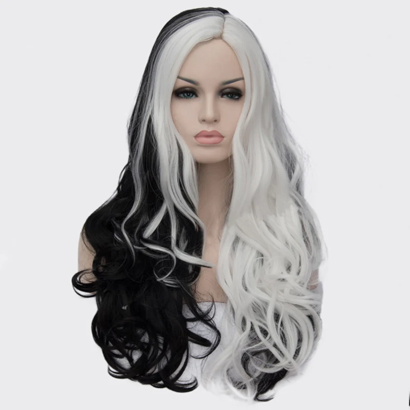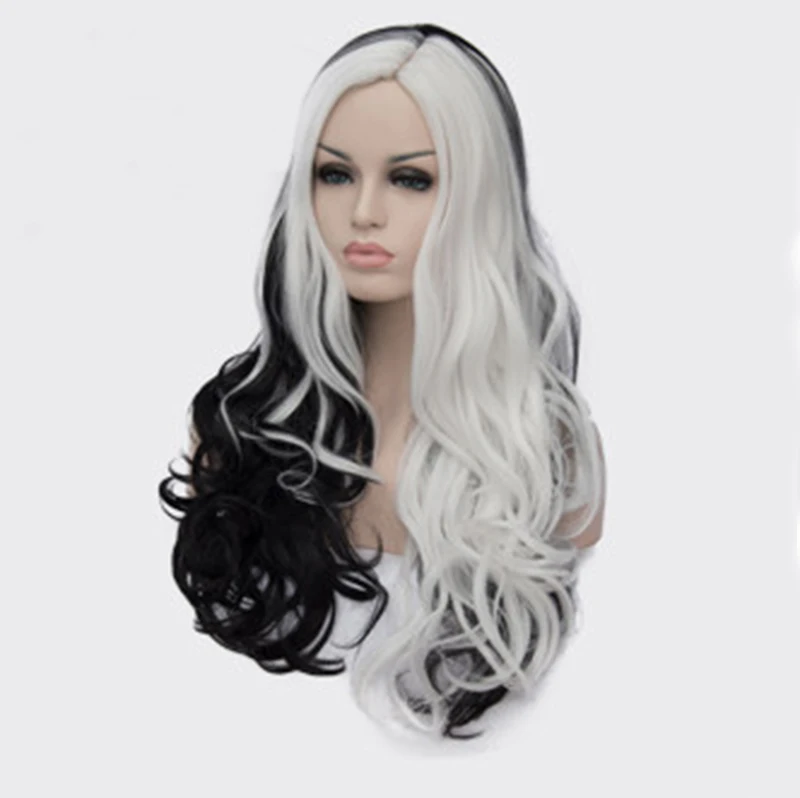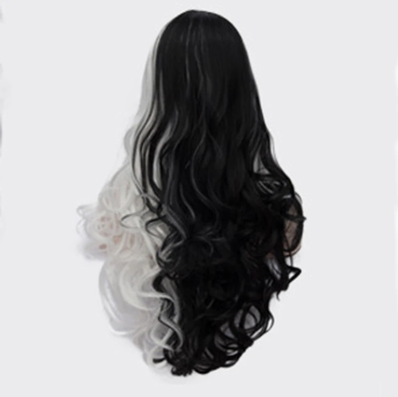 Черно-белые кудрявые волосы CRUELLA de Vil длиной 75 см для девочки, термостойкие парики для косплея + шапочка для парика