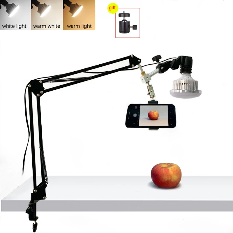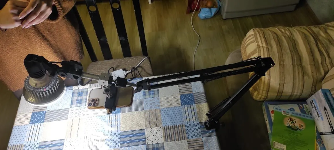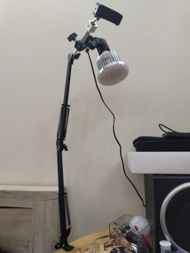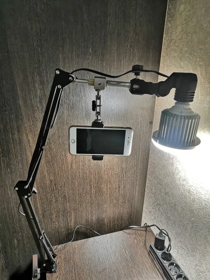 Посылка дошла быстро, с российского склада. Все очень добротное и надёжное. Все соединения металлические и в сборе нагрузку держит. Не думал, что лампа будет настолько большой, но зато она очень яркая и не мерцает на видео. Правда на пульте сплошные иероглифы, но это не большая проблема. Продавец положил ещё небольшую приспособу чтобы закрепить телефон отдельно.