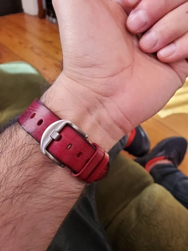 С виду очень красивый ремешок, но уже при установке на часы становится очевидно, что натуральная кожа тут и близко не стояла, царапается от любого касания с корпусом, даже от своей же пряжки остаются царапины и повреждения... верхний слой буквально слазит о контакта с твёрдыми предметами (корпус часов, пряжка). Остался недоволен покупкой;((