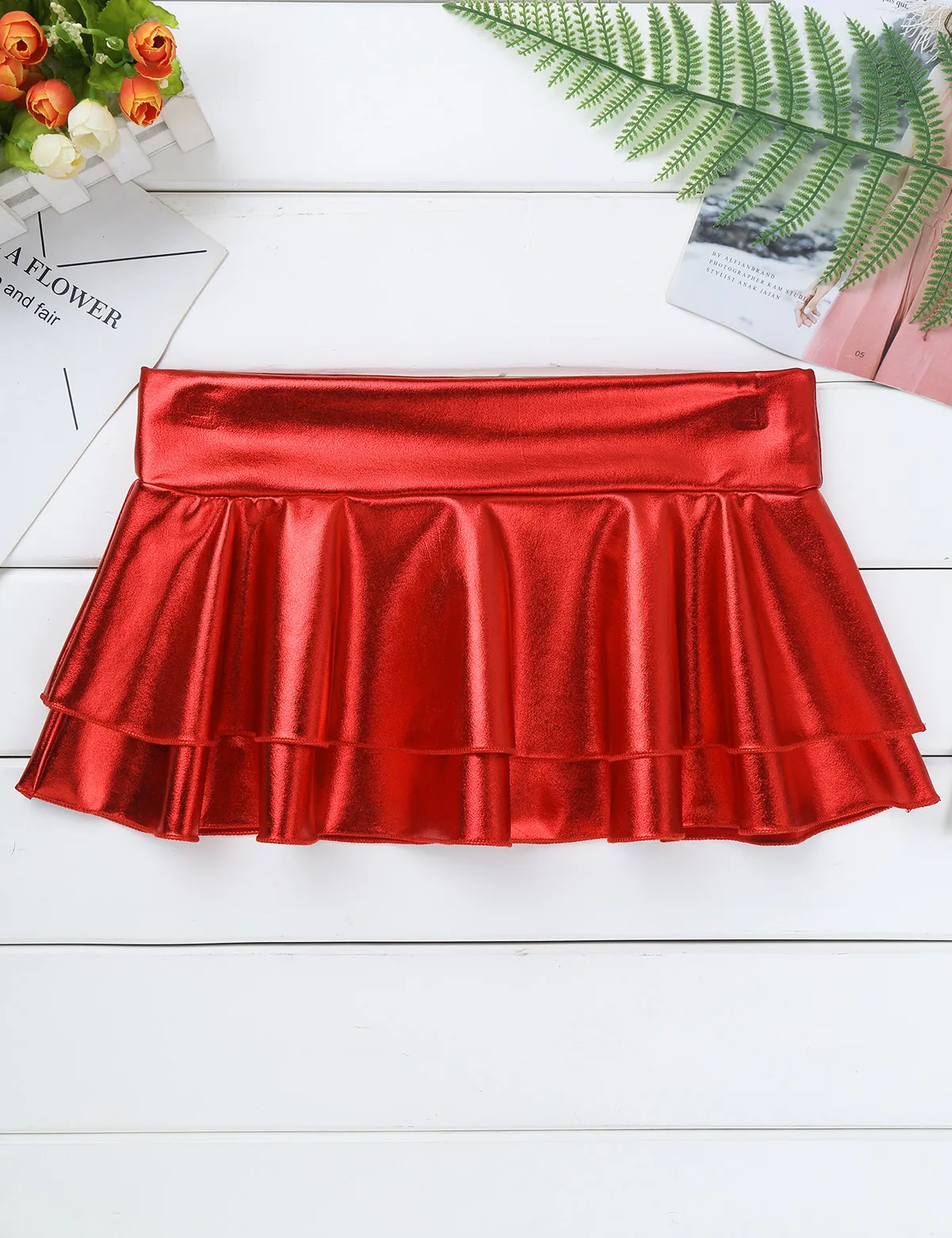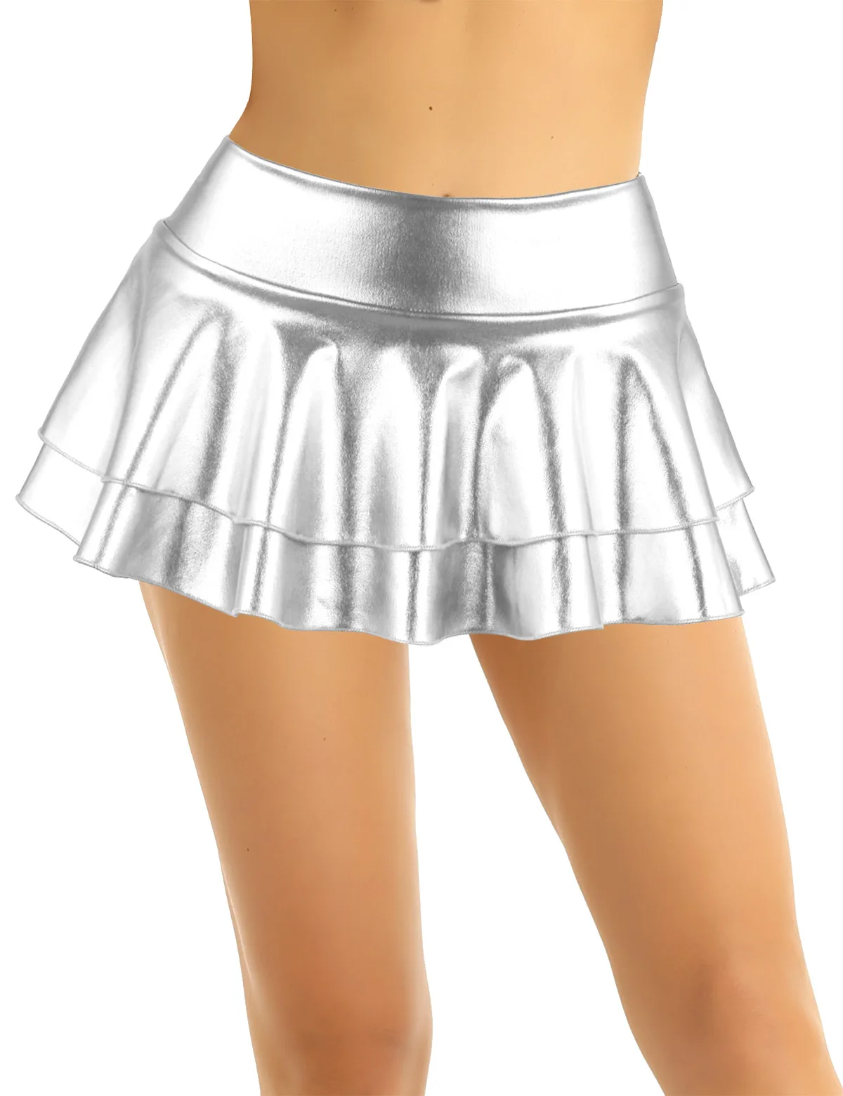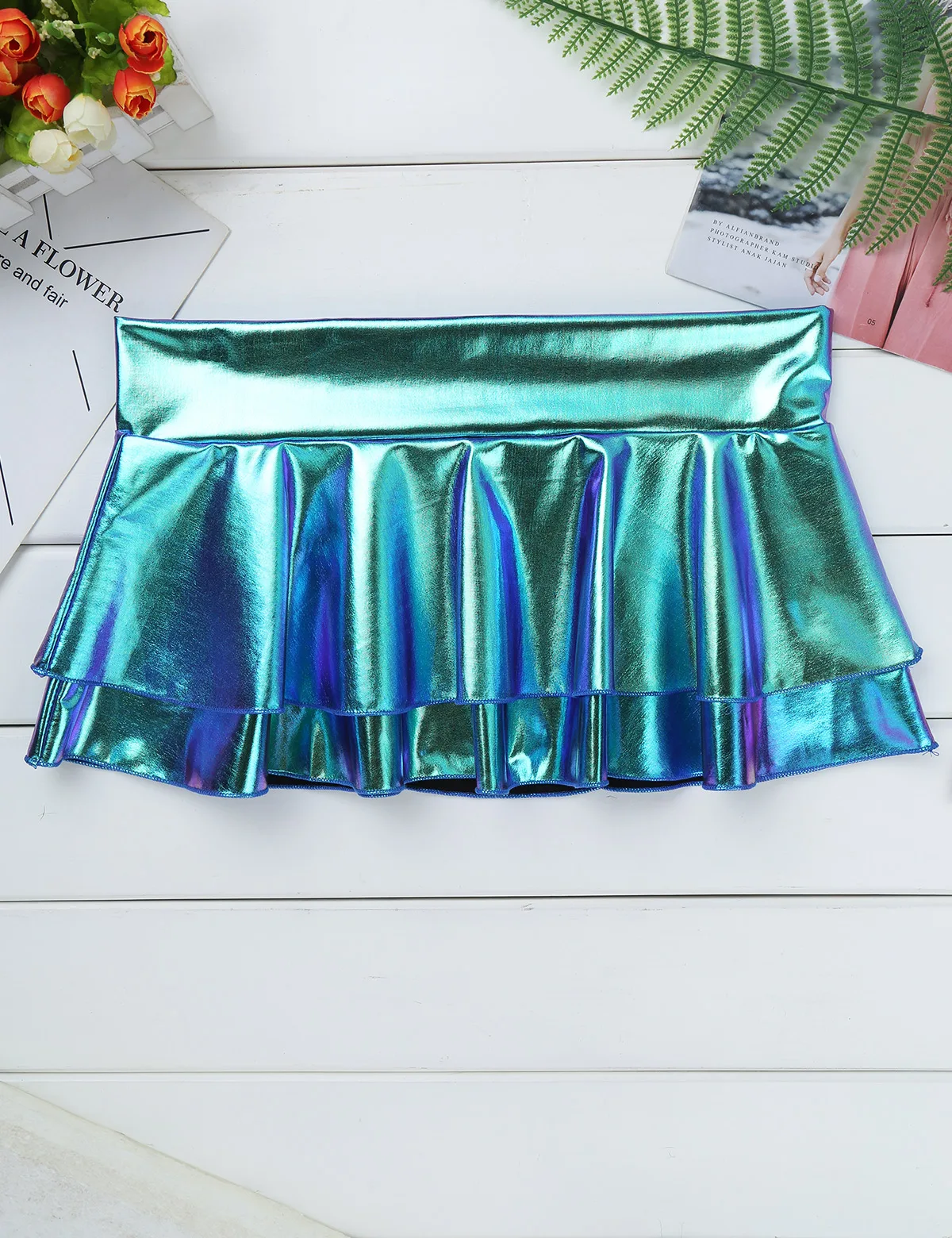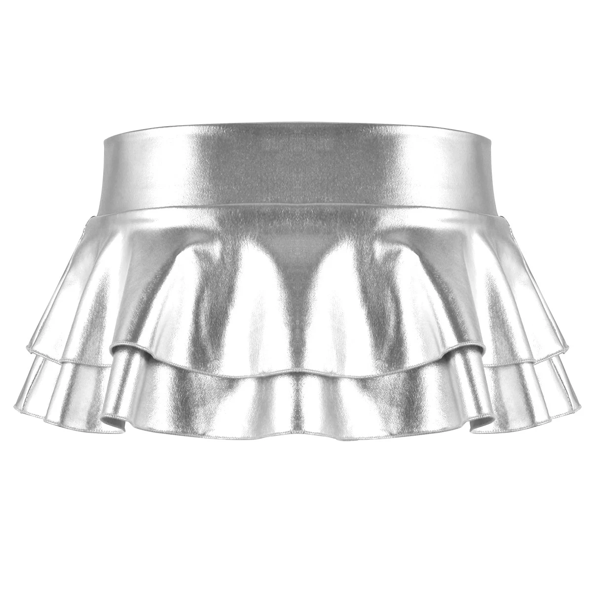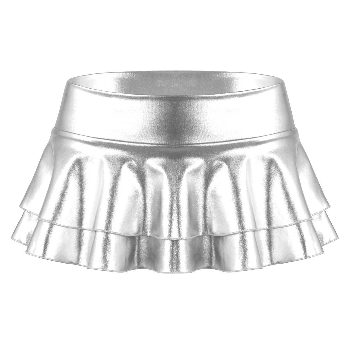 Женская Блестящая металлическая юбка с низкой посадкой, гофрированные шорты для танцев на шесте, трико, Клубные, вечерние, сексуальные мини юбки, танцевальный фестивальный Рейв, костюм