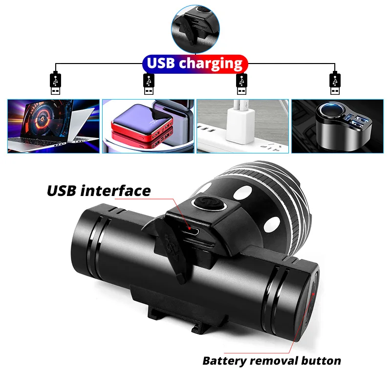 Встроенный аккумулятор, маленький и изысканный, используется в качестве велосипедного светильник и флэш-светильник, изготовленный из алюминиевого сплава, хорошее рассеивание тепла, встроенный перезаряд и разрядка IC, зарядка через USB, кронштейн с вращением на 360 градусов, мощность и индикация зарядки, 3 переключателя
