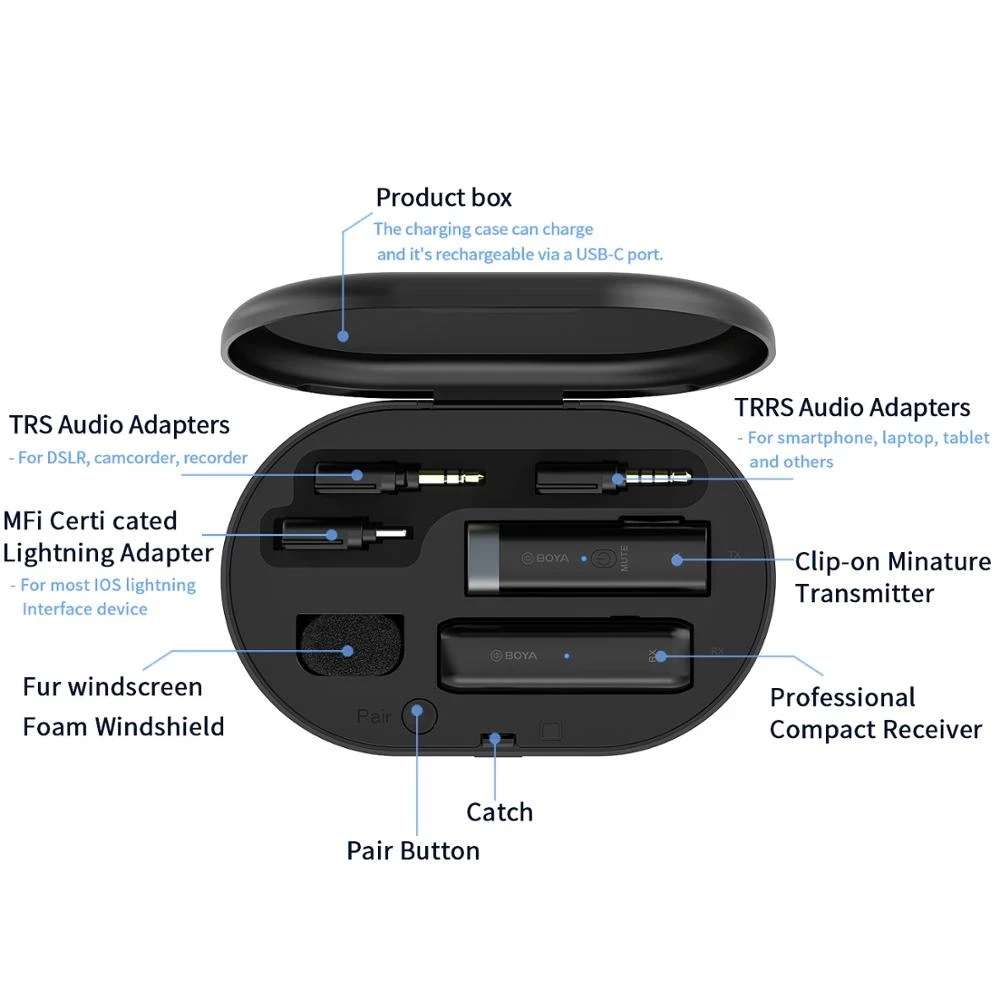 -Чехол для зарядки-Передатчик Minature с зажимом-Профессиональный Компактный приемник-Сертифицированный MFi адаптер Lightning-3,5 мм TRS адаптер-3,5 мм TRRS адаптер-Поролоновое ветровое стекло-Ветровое стекло из меха-30 см/11,8 ''Тип с разъемами типа C и USB-A зарядный кабель