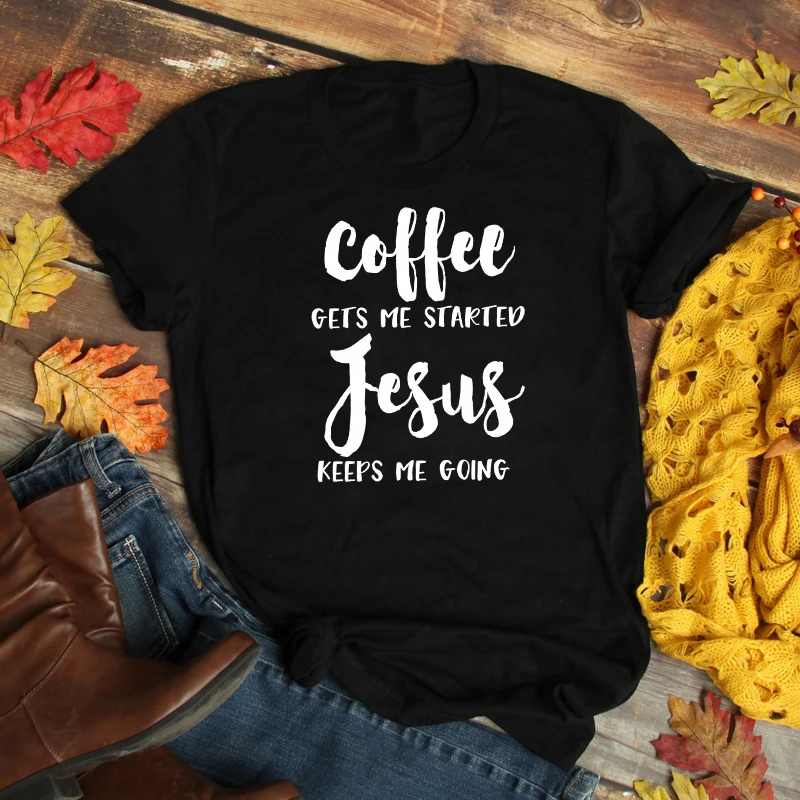 Женская футболка с надписью Coffee Gets Me Start Jesus Keep Me Going, Повседневная футболка с надписью Bible Verse