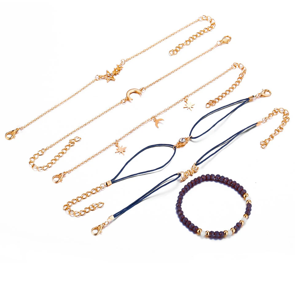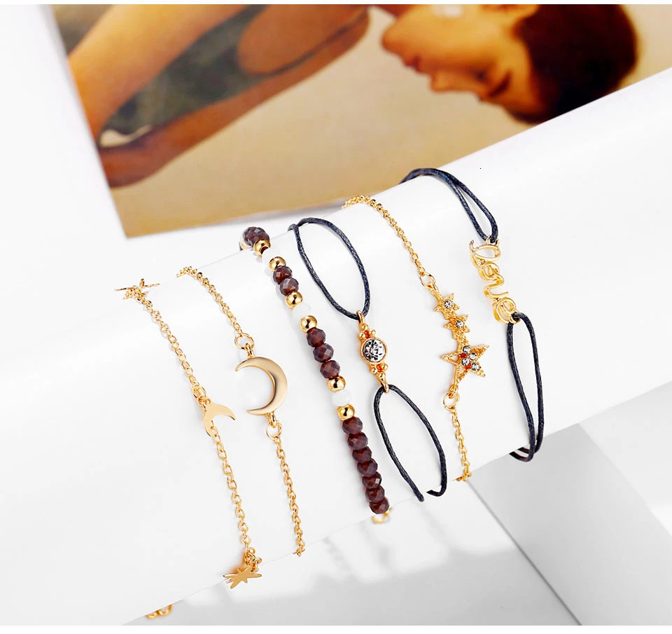 Jouval 6 шт.компл. в богемном стиле Звезда Луна Любовь браслет с шармами для женщин бусины кристалл звено веревка цепочка браслеты и браслеты женские украшения