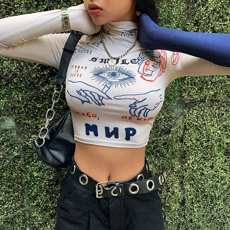 Женская водолазка с длинным рукавом BOOFEENAA, привлекательный укороченный топ с принтом в виде граффити, C94-BD10
