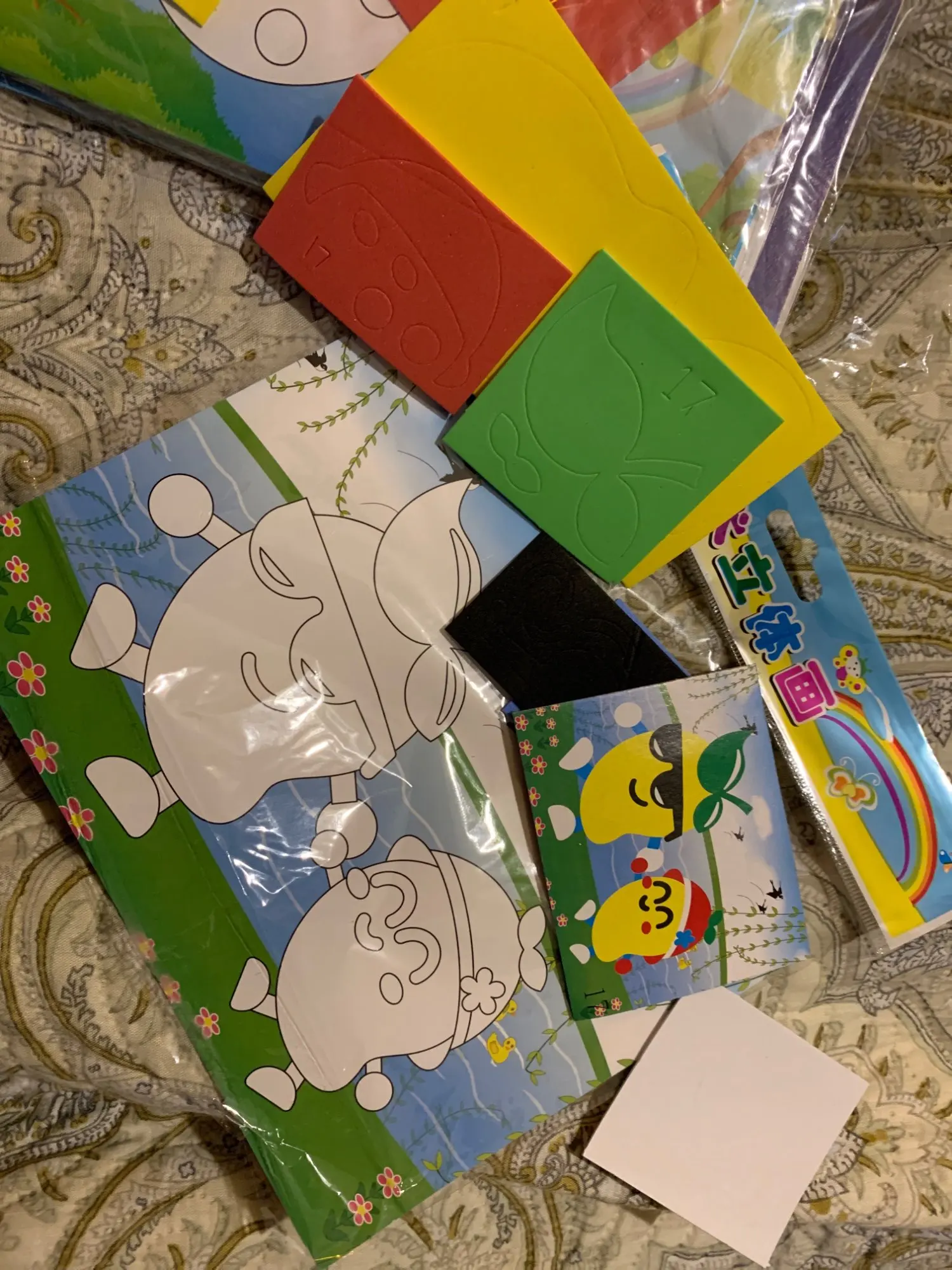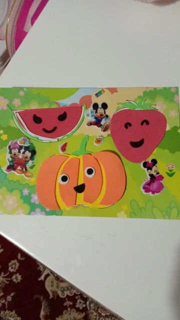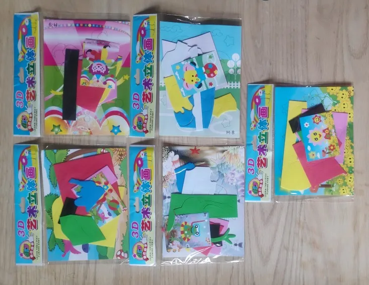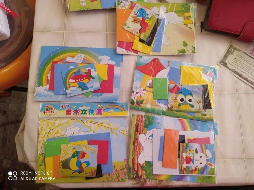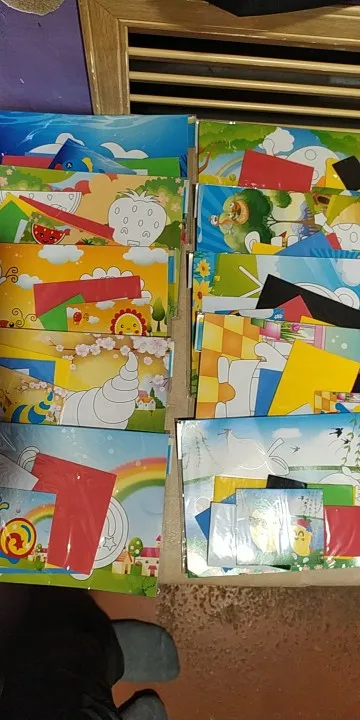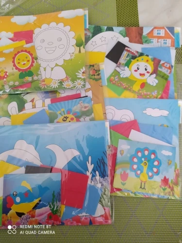 muy bueno. viene cada uno en su bolsa de plástico y así no se confunden, o puedes regalar... cada uno viene con el dibujo pequeñito hecho de modelo. la goma Eva se despega muy bien del papel protector para poder pegar luego en la base. A mi niño de cuatro años no le gustan mucho las cosas de colorear, pero esto lo quiso hacer nada más verlo. le ha gustado mucho. yo le ayudo un poco para que sepa en qué orden pegarlo.