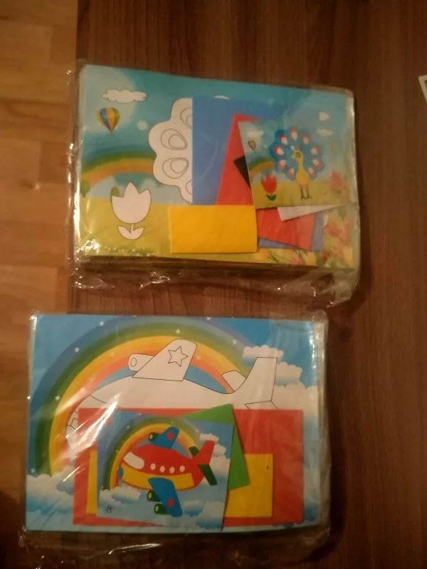 Классные пазлы, случайно заказала 2 комплекта, и не пожалела, пришли разные) ребенку нравиться, но без помощи взрослого пока ни как. Наклеивать нужно сначала большие части, а на них уже детальки, мы сначала не посмотрели и пришлось переклеивать. Когда отклеиваешь от картинки нужный кусочек, то он может или растянутся или порваться, имейте ввиду. Лучше заранее посмотреть порядок наклеивания деталей, а не следовать желанию ребенка. Продавцу спасибо, рекомендую. В подарок купон на 2 бакса на след.покупку.