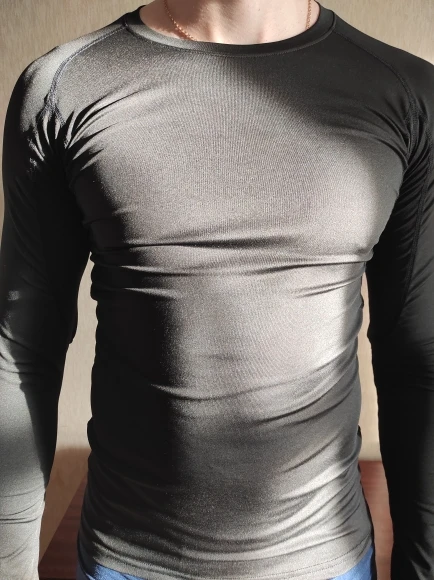 Раш на вид/ощупь отличного качества. Несмотря на плотность отлично пропускает воздух, скорей всего и влагу будет отводить хорошо. Оттенок чуть темней, чем на фото. На мой 52-54 с пузиком сел отлично). Так как сравнить не с чем, считаю, что за 700 рублей прекрасный вариант, рекомендую