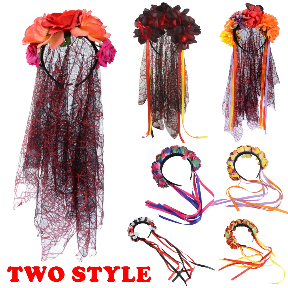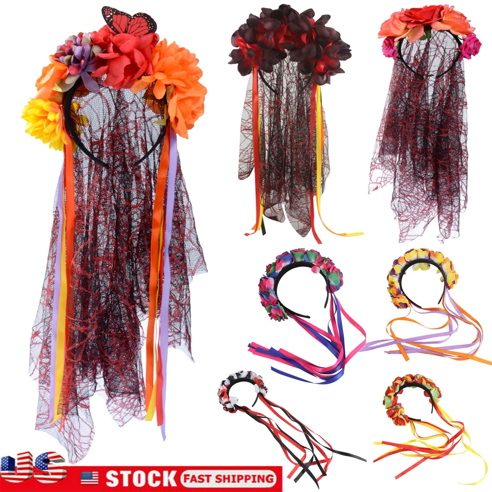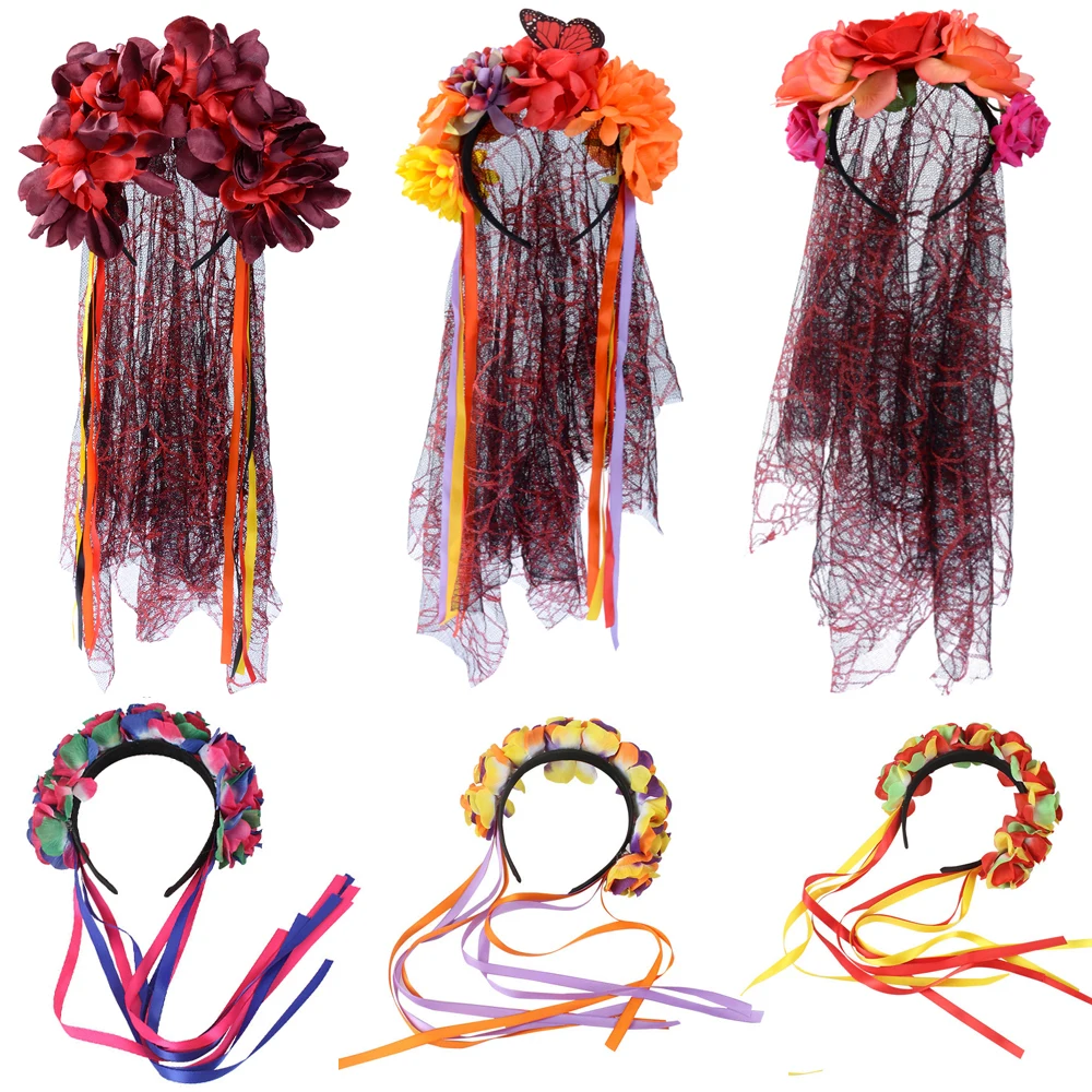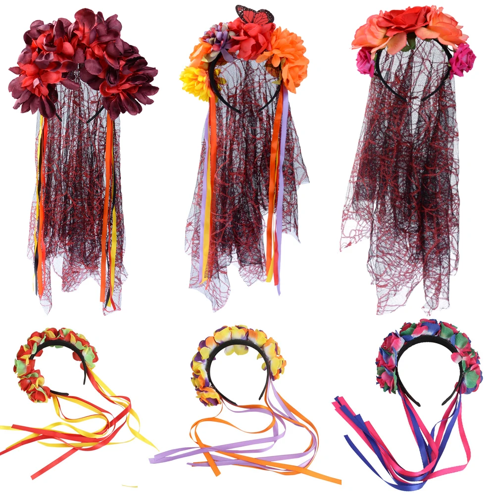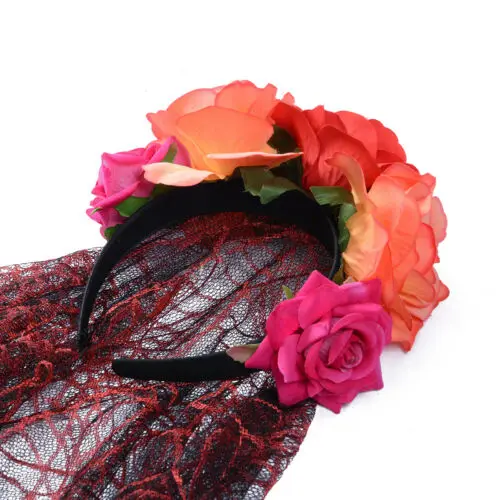Женское платье с вуалью для девочки на тело розы для невесты с цветочным узором мексиканский День мертвых повязка на голову, повязка на голову, костюмы на Хэллоуин нарядное вечерние аксессуары для костюмов
