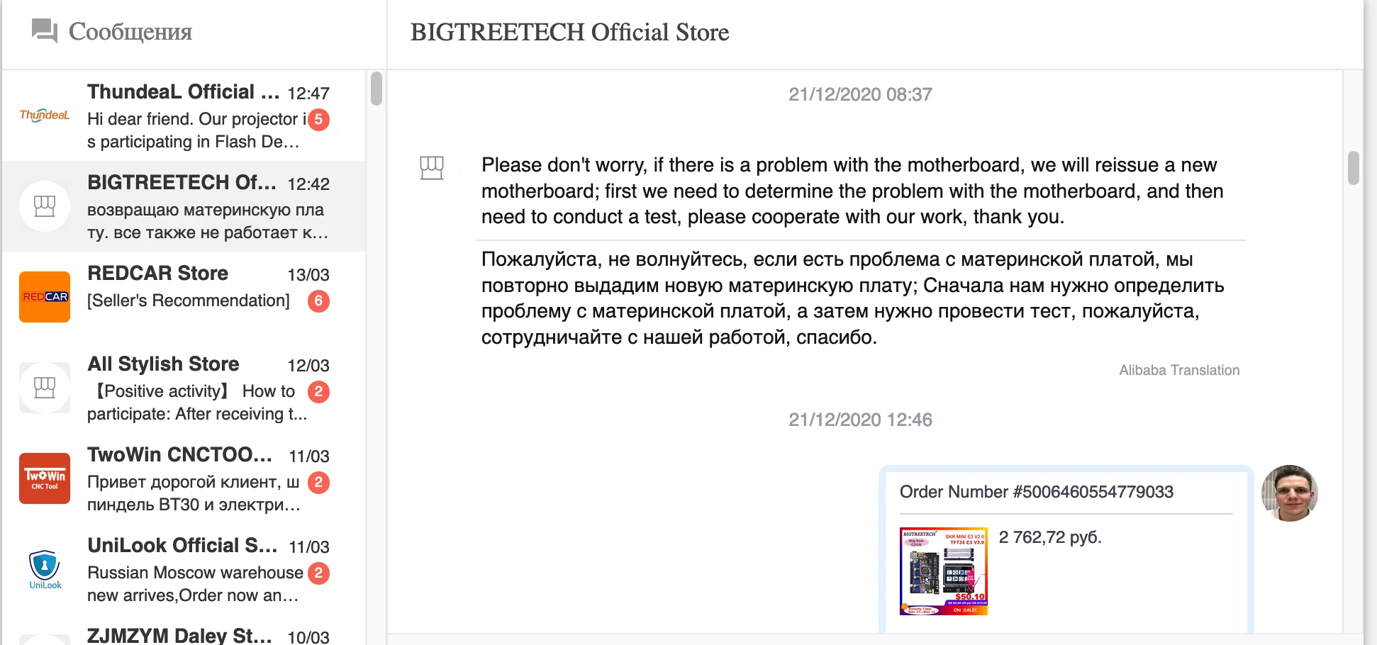 2020-11-08 02:44, сделал заказ 5006460554779033 в этом магазине "Материнская плата BIGTREETECH BTT SKR MINI E3 V2 32 бит, встроенная TMC2209UART" https://trade.aliexpress.ru/order_detail.htm?orderId=5006460554779033 за 2790 рублей. Товар доставлен 2020.12.02 11:22. После установки было выяснено, что плата неисправная. Обновить, прошить или еще что-то не получается. Открыл спор, спор закрыли без возврата. Продавец предложил обменять товар. Я отправил его 25/12/2020 ra750715865ru за свой счет обратно, в надежде, что они починят НЕИСПРАВНЫЙ товар или ЗАМЕНЯТ его. Никаких действий. ничего. Может такие отзывы помогут решить мою проблему.