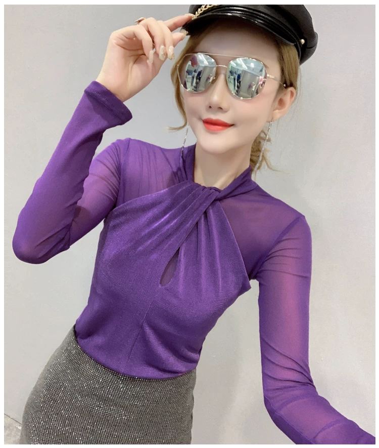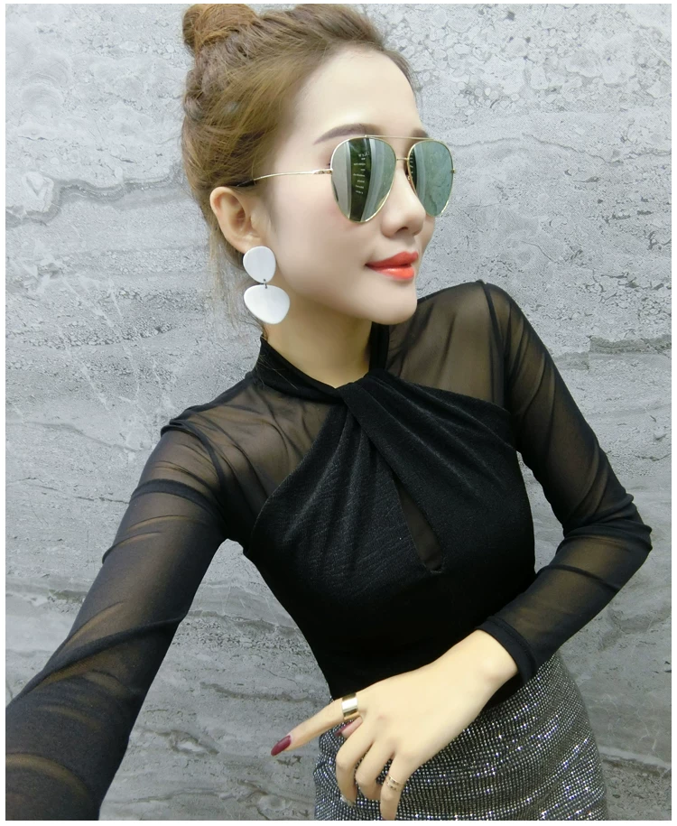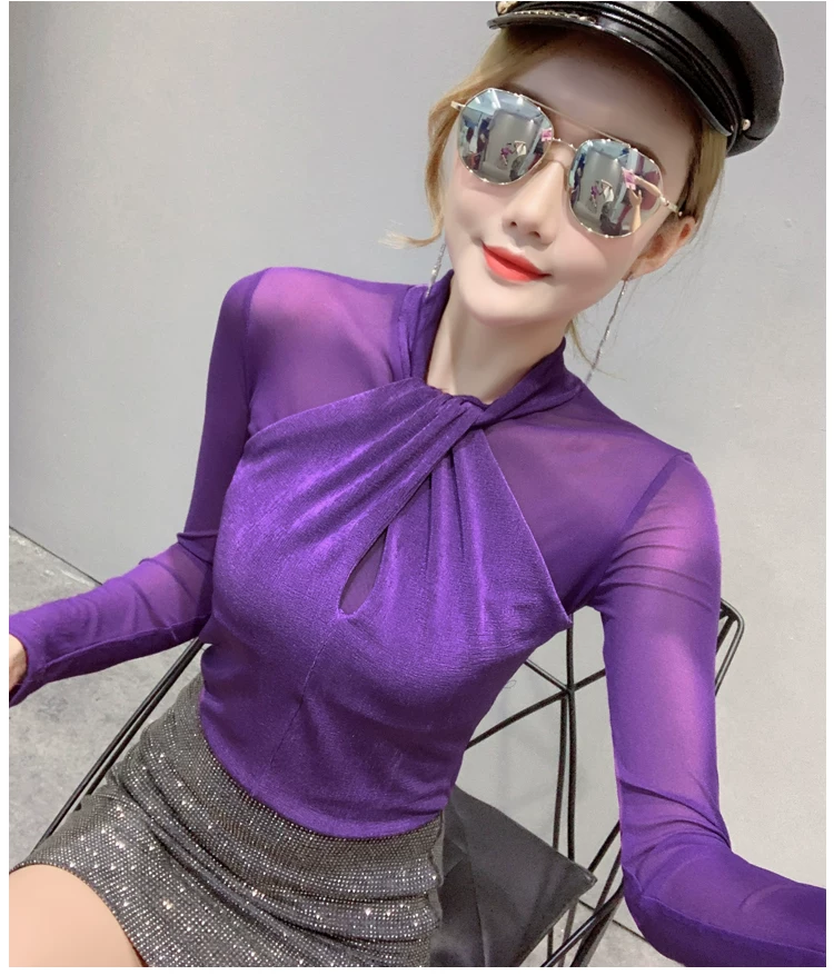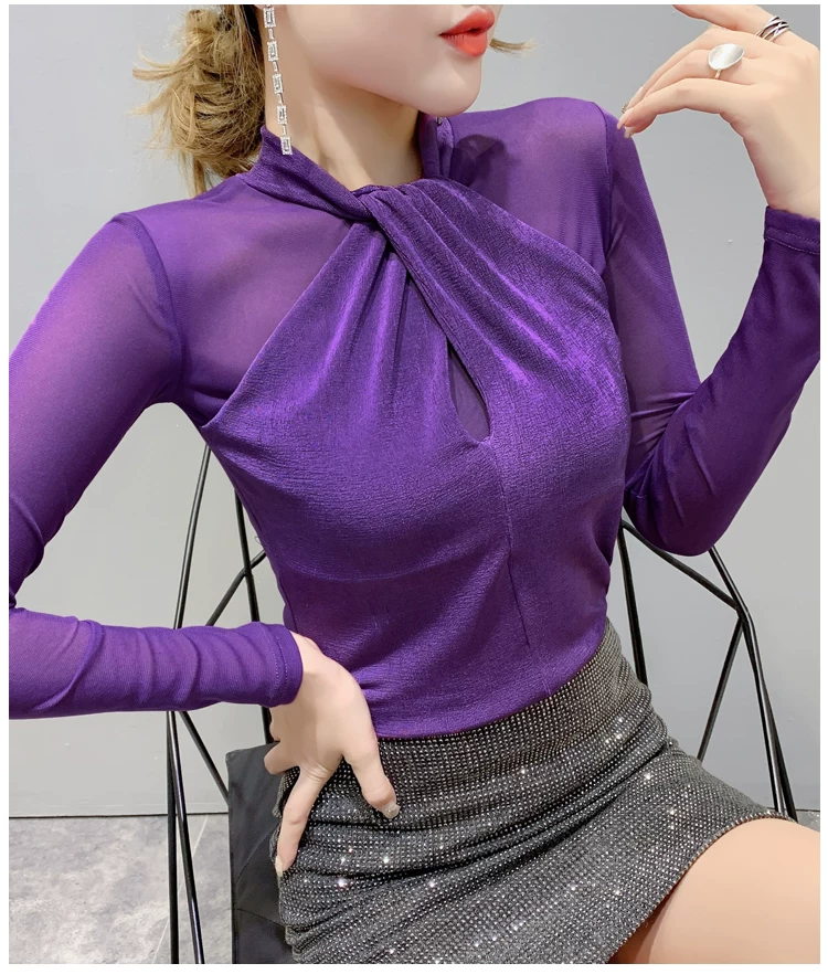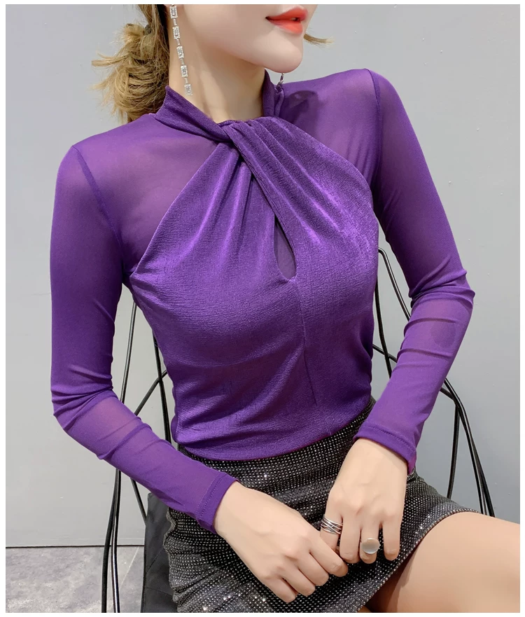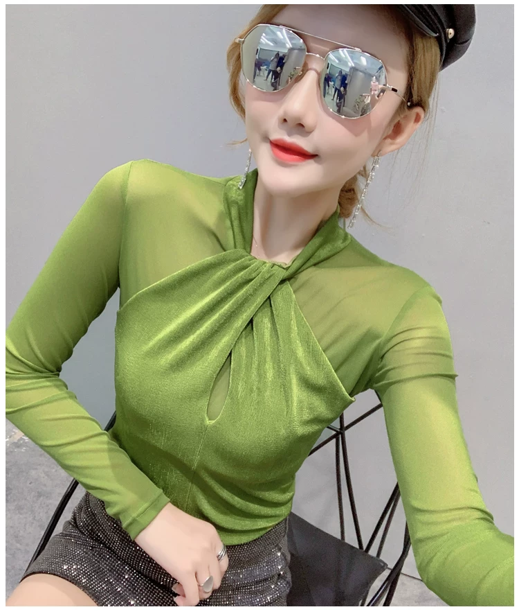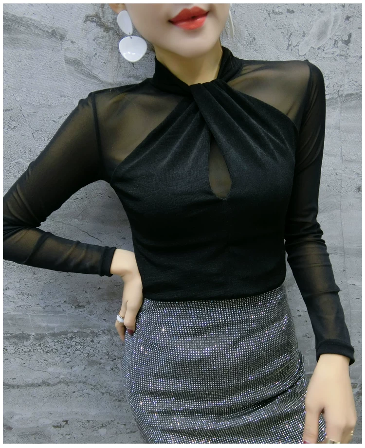 Женские топы и блузки, новинка 2021 года, сексуальная сетчатая прозрачная элегантная рубашка с перекрестным швом, блуза с длинным рукавом, размера плюс, блузка, 81J
