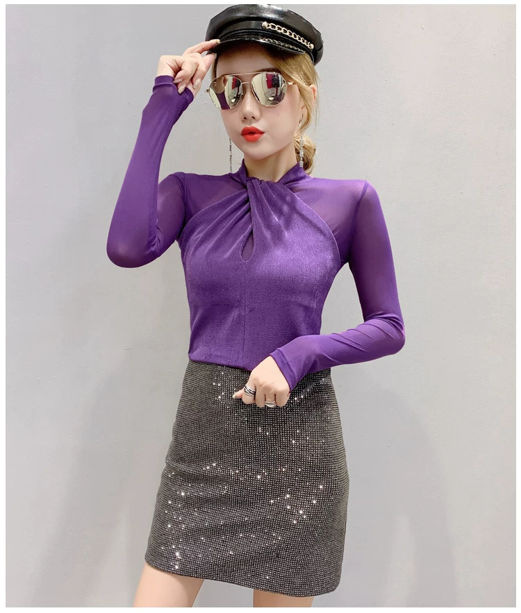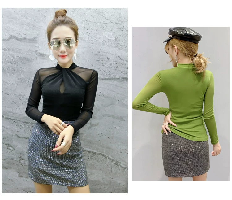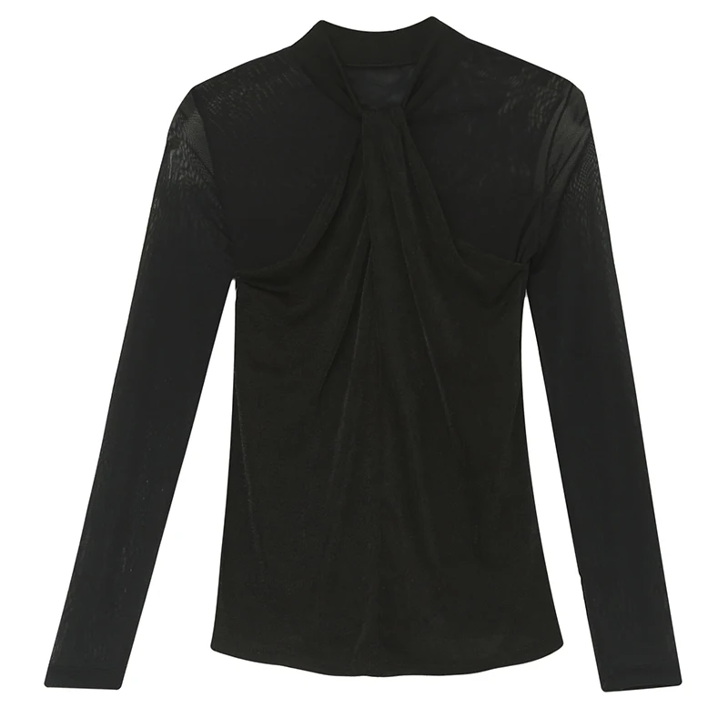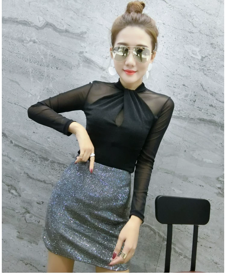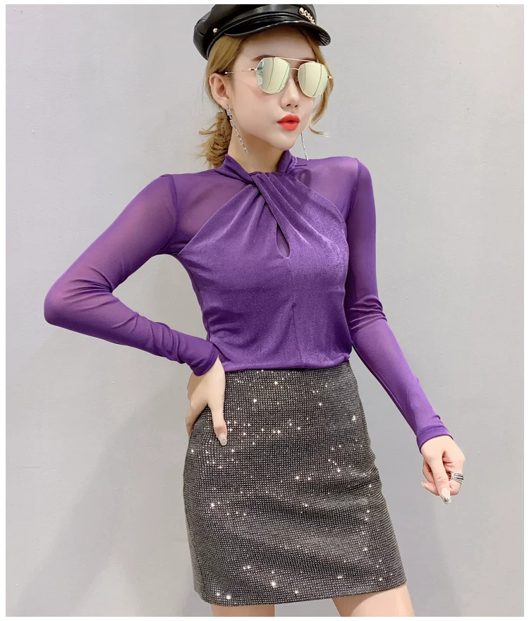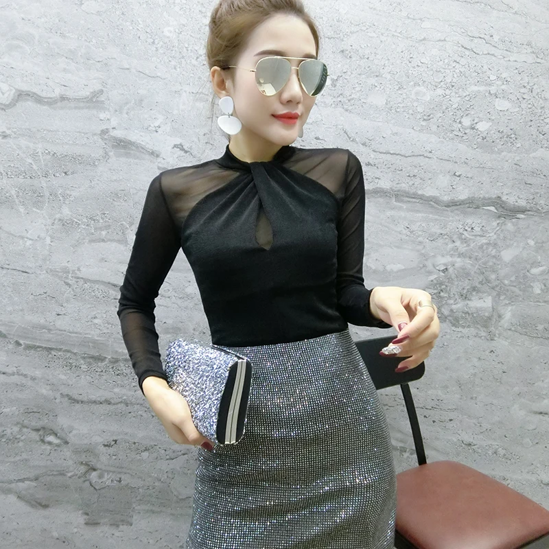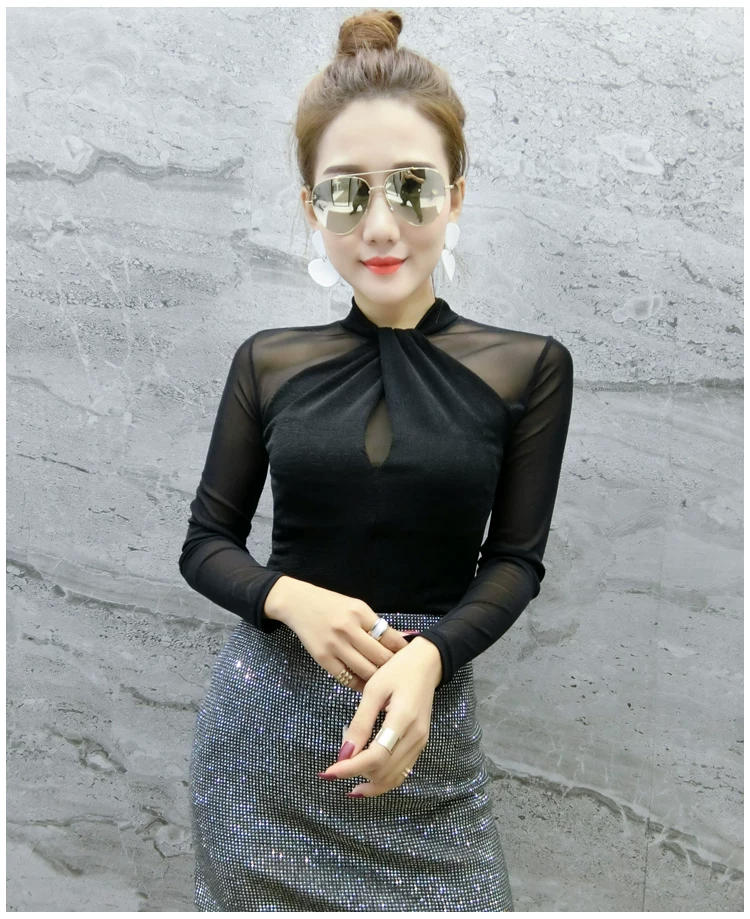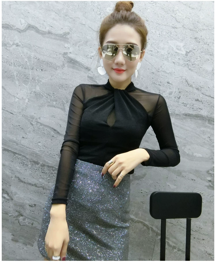 Женские топы и блузки, новинка 2021 года, сексуальная сетчатая прозрачная элегантная рубашка с перекрестным швом, блуза с длинным рукавом, размера плюс, блузка, 81J