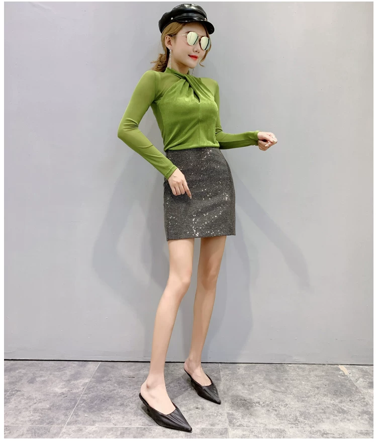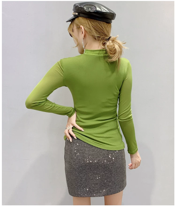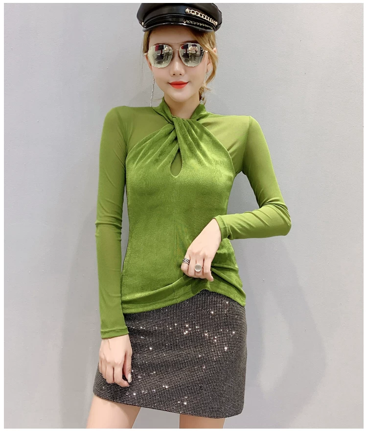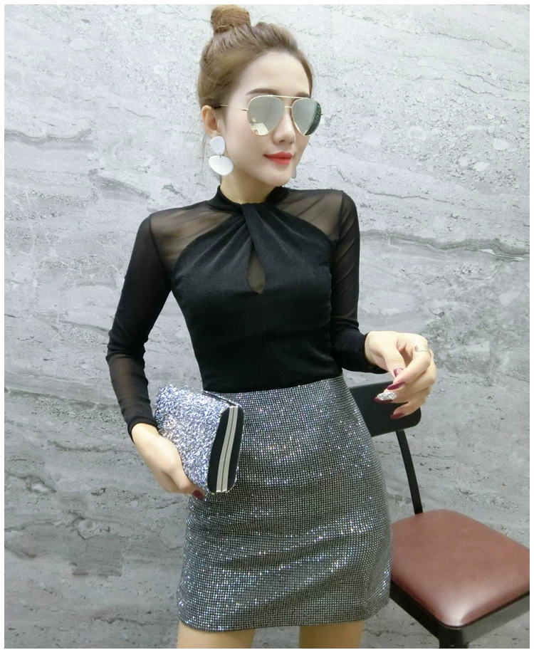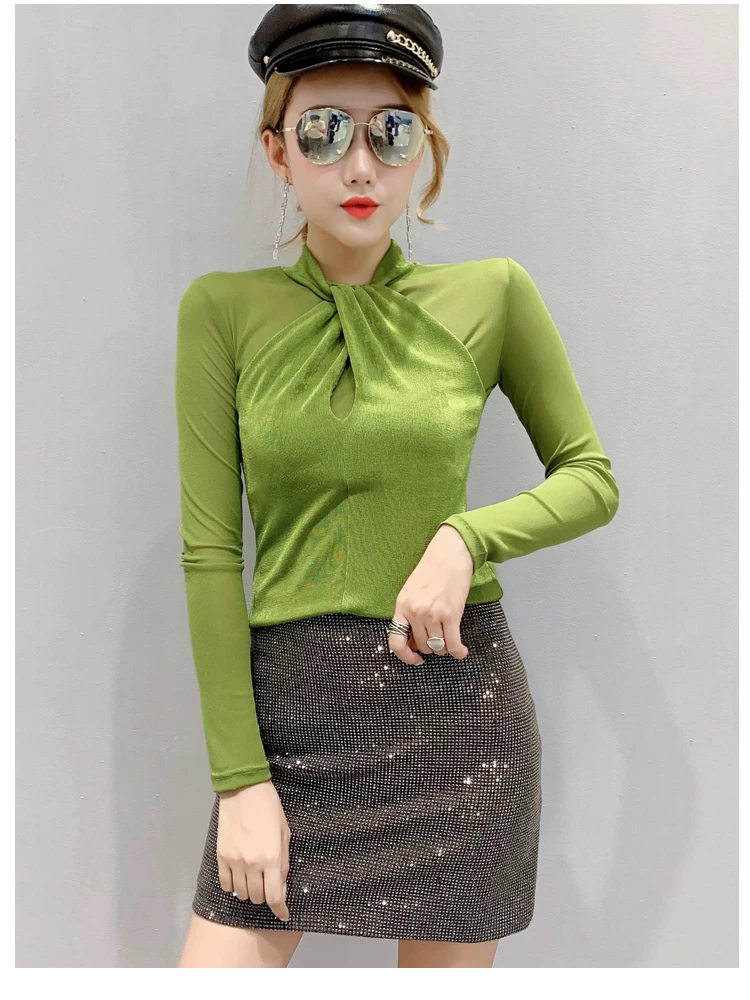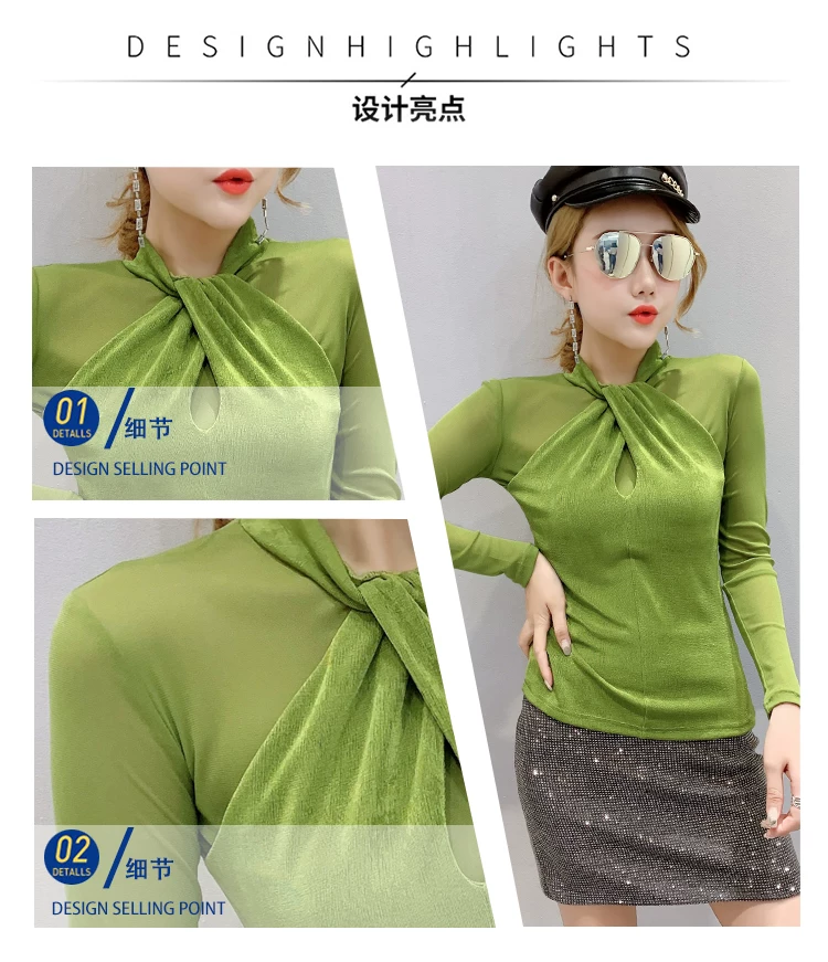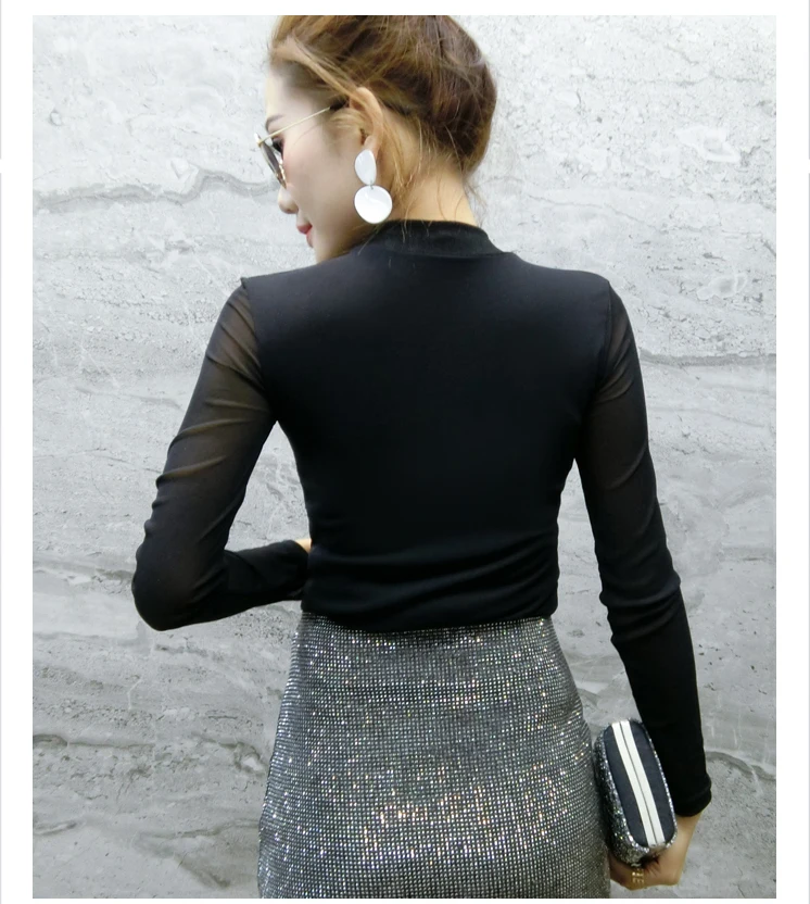 Женские топы и блузки, новинка 2021 года, сексуальная сетчатая прозрачная элегантная рубашка с перекрестным швом, блуза с длинным рукавом, размера плюс, блузка, 81J