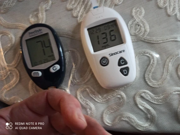 Глюкометр брал маме, она сразу сделала замер, показал 5,8 ну только не рано утром и не на тощак, вроде норм. Все это мелочи, меня смутило в табличка об результатах и там до 7 mmol/l это оказывается норма, блин меня это убило, раньше норма не выше 5,5. Сейчас нормативы подняли и стали уже до 6. Так что посмотрим дальше как будет показывать и отпишусь. Но мама сказала что ей он нравится и другого ей не нужно, это её первый глюкометр и это первый замер дома.