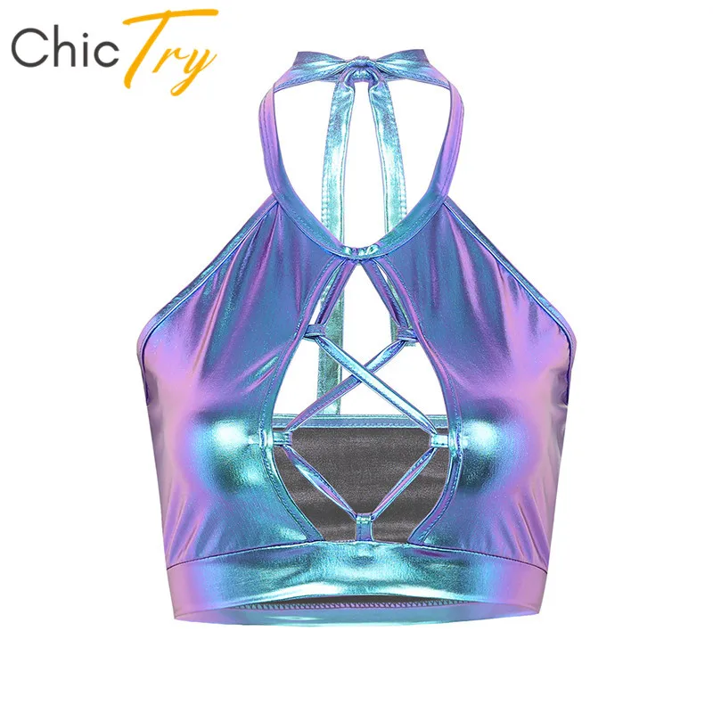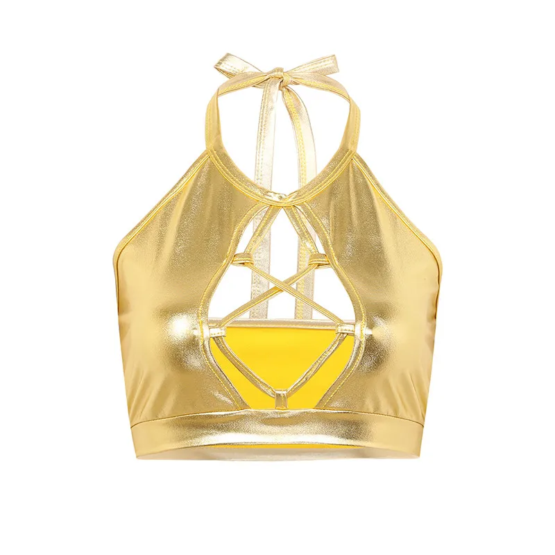 Женский соблазнительный укороченный топ с эффектом смачивания, металлический укороченный топ на бретелях спереди, с открытой спиной, для клувечерние, для выступления, для танцев на шесте, женский костюм
