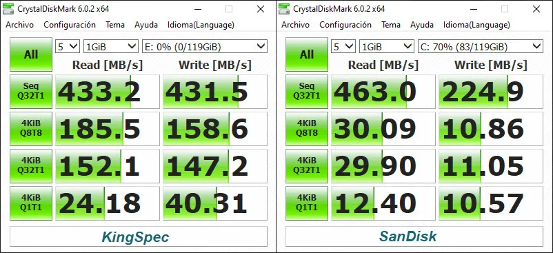 Около 1 недели. Кажется, работает хорошо. По сравнению с моим 7 летним SSD SATA от SanDisk с 7800 рабочих часов и около 30 ТБ чтения данных + 30 ТБ записи. Полученная информация очень хорошая. Даже через некоторое время не будет так хорошо разогреваться, это для гаражного ПК, который включается время от времени, так что я не беспокоюсь о том, что это полезная жизнь. Добавьте больше фотографий (C: диск старый SanDisk и E: диск новый KingSpec, называемый P3). Скорость была протестирована следующим образом (SanDisk на SATA порт, KingSpec на USB3 порт)