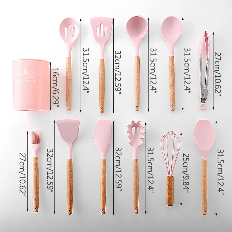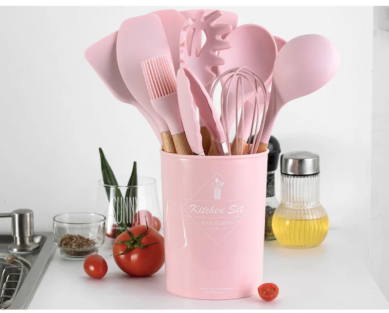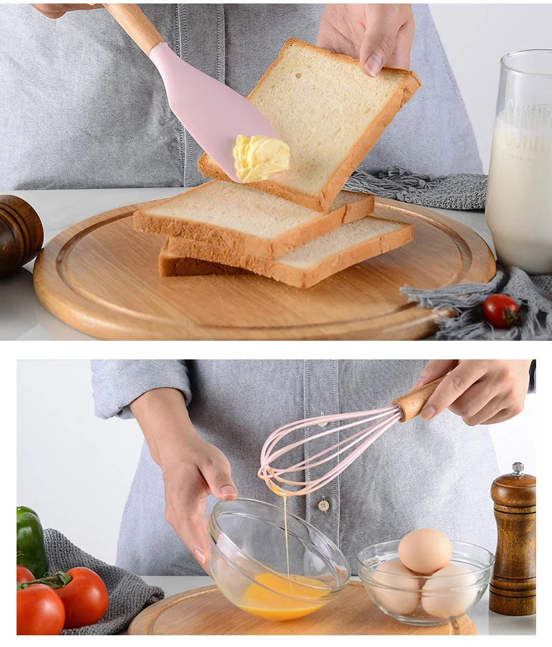 Набор кухонной утвари, инструменты для выпечки, ручка из твердой древесины с ведром для хранения, розовая силиконовая кухонная утварь, набор из 11 предметов