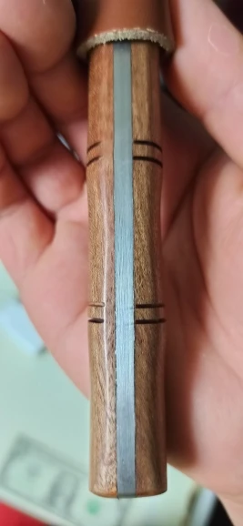 сразу отрицательный момент - тяжелый, что увеличивает шанс потерять нож, хотя к ножнам нареканий нет, жаль, что вместо рукояти накладки, слишком много металла, толстый обух, отсюда и тяжесть ножа. Но кто догадался сделать на накладках поперечные пропилы!? Вся грязь, кровь и т.п. будет накапливаться в этих пропилах, красоты они не добавили, а проблемы налицо. Думаю сейчас, чем их заделать, пока не начал использовать нож на охоте. Очень надеюсь компенсировать отрицательные моменты режущими свойствами клинка. Но это потом.
