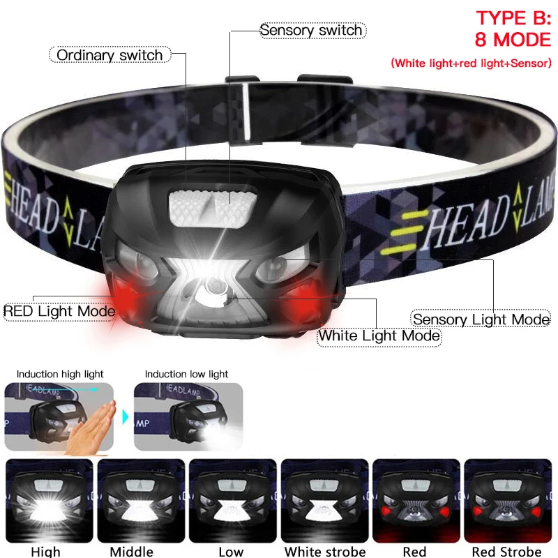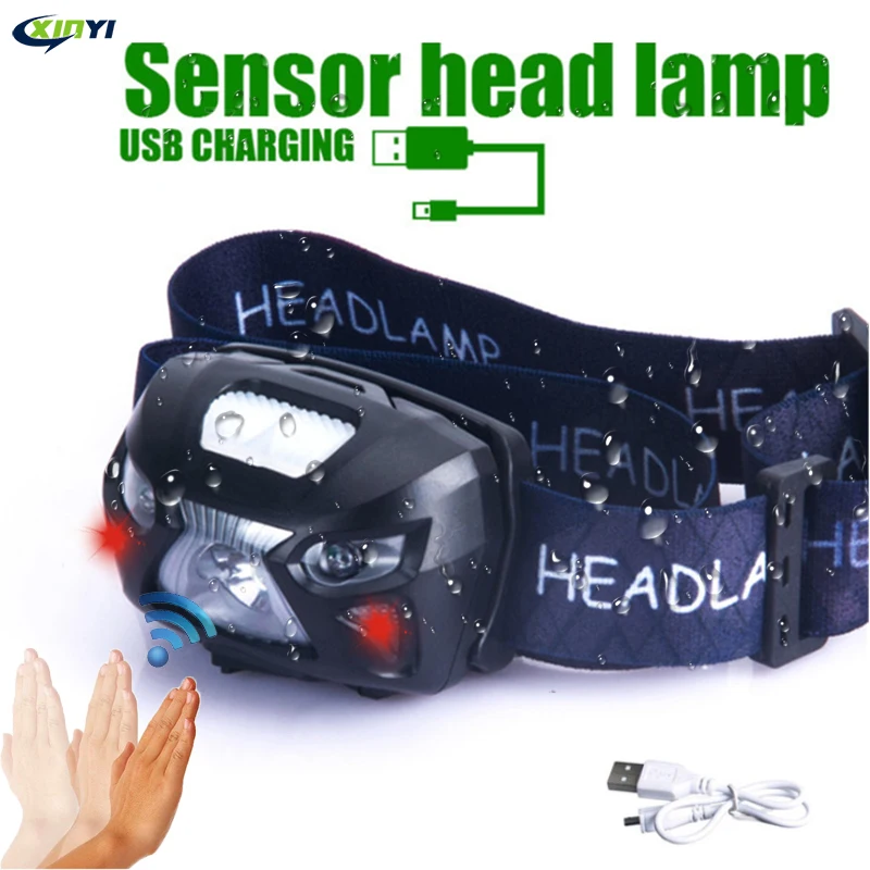 Мощный светодиодный налобный фонарь со встроенной батареей, перезаряжаемый светодиодный налобный светильник рь с датчиком движения тела, налобный фонарь для кемпинга, фонарик для кемпинга