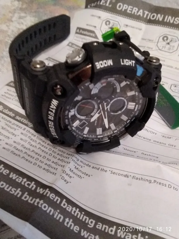 часы получил, посылка пришла в течении двух недель,с продавцом не общался. часы выглядят солидно. очень слабая подсветка, а без подсветки электронных цифр не видно вообще. на водонепроницаемость не проверял. в настройки разобрался быстро методом тыка