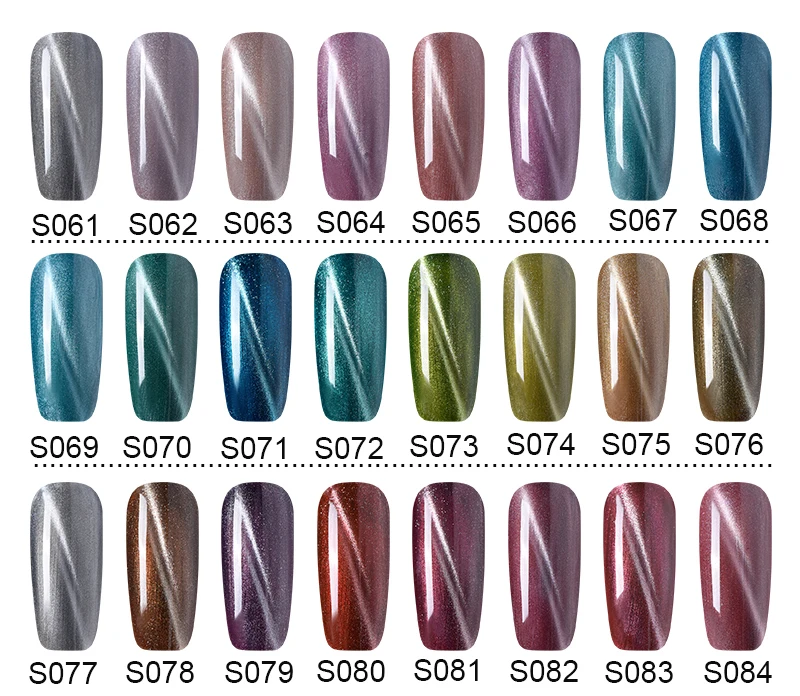 1. Подготовьте ногти с помощью УФ-базового покрытия SHEENIA и высушите его под ультрафиолетовая/Светодиодная лампа. 2. Нанесите черный гель, высушите, затем 2 слой, высушите. (темное основание может помочь получить лучший эффект хамелеона) 3. Нанесите гель кошачий глаз. (Не вылечивайте!) 4. Используйте магнитную палку близко к ногтю. Чем ближе расстояние, тем более очевидный эффект. Но держите подальше от геля. Эффект зависит от линии магнита и направления, в котором вы его положили. 5. Высушите его под УФ лампой или светодиодный светильник. 6. Нанесите верхнее пальто и высушите его под ультрафиолетовая/Светодиодная лампа.