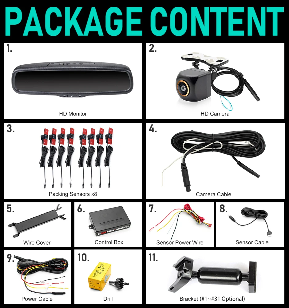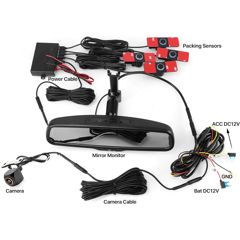 * 5 дюймов зеркало заднего вида DVR монитор x 1* HD рыбий глаз задняя камера x1* 4 / 6 / 8 шт./спереди и сзади сенсоров на выбор* Видео кабель камеры x1* Крышка провода x 1* Блок управления радаром x 1* Кабель питания с датчиками x 1* Датчик 6 м видео кабель x 1* Кабель питания для монитора x 1* 22 мм/16,5 мм дрель-1 шт.* Оригинальный кронштейн (#1 ~ #31) опционально