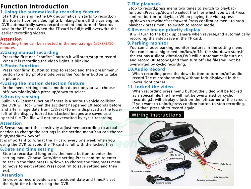 * HD 5 дюймов 854*480 IPS ЖК-экран. Яркость: 500 кд/м2 (макс.).* Специальный оригинальный металлический кронштейн, идеально подходит вашему автомобилю.* Чипсет Novatek 96658. 2 камеры видео рекордер черный ящик.* Автоматическое переключение на изображение заднего вида при переключении на обратную передачу.* Широкий угол 140 ° для задней камеры.* Видео датчик парковки с 4 датчиками радара. Дисплей на зеркальном мониторе.* 170 ° Широкий угол для фронтальной камеры, направление камеры можно регулировать.* Можно делать фотографии с этим продуктом (1200 Вт пикселей)* Когда вы Остановите автомобиль, он начнет запись, как только у него будет небольшая вибрация* Разрешение видео: 1080P ( 1920*1080 ) / 720P (1280*720) / VGA (720*480)• Камера с 6 слоя стеклянная линза для записи Full HD видео.* Поддержка g-датчика, обнаружения движения.* Поддержка циклической записи.* Диафрагма F2.0, хорошее зрение в ночное время.* Интеллектуальная технология обработки изображений, обработанная WDR и HDR, чтобы убедиться, что изображение в любое время.* Стиль записи: фронтальная камера, камера заднего вида, фронтальная и задняя камера могут быть изменены одновременно.* Язык: английский, русский, испанский, немецкий, корейский, японский, французский, португальский, итальянский, упрощенный китайский, традиционный китайский, иврит