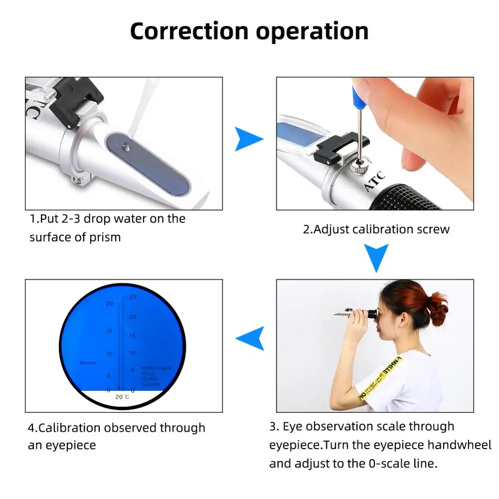 О: если масштаб не виден, поверните черную часть хвоста рефрактометра, чтобы сфокусировать изделие. B. Если масштаб наклонен, слегка поверните черную часть в середине рефрактометра, чтобы отрегулировать масштаб в горизонтальном состоянии. В. Если вы столкнулись с неразлучной проблемой, пожалуйста, свяжитесь с нами.